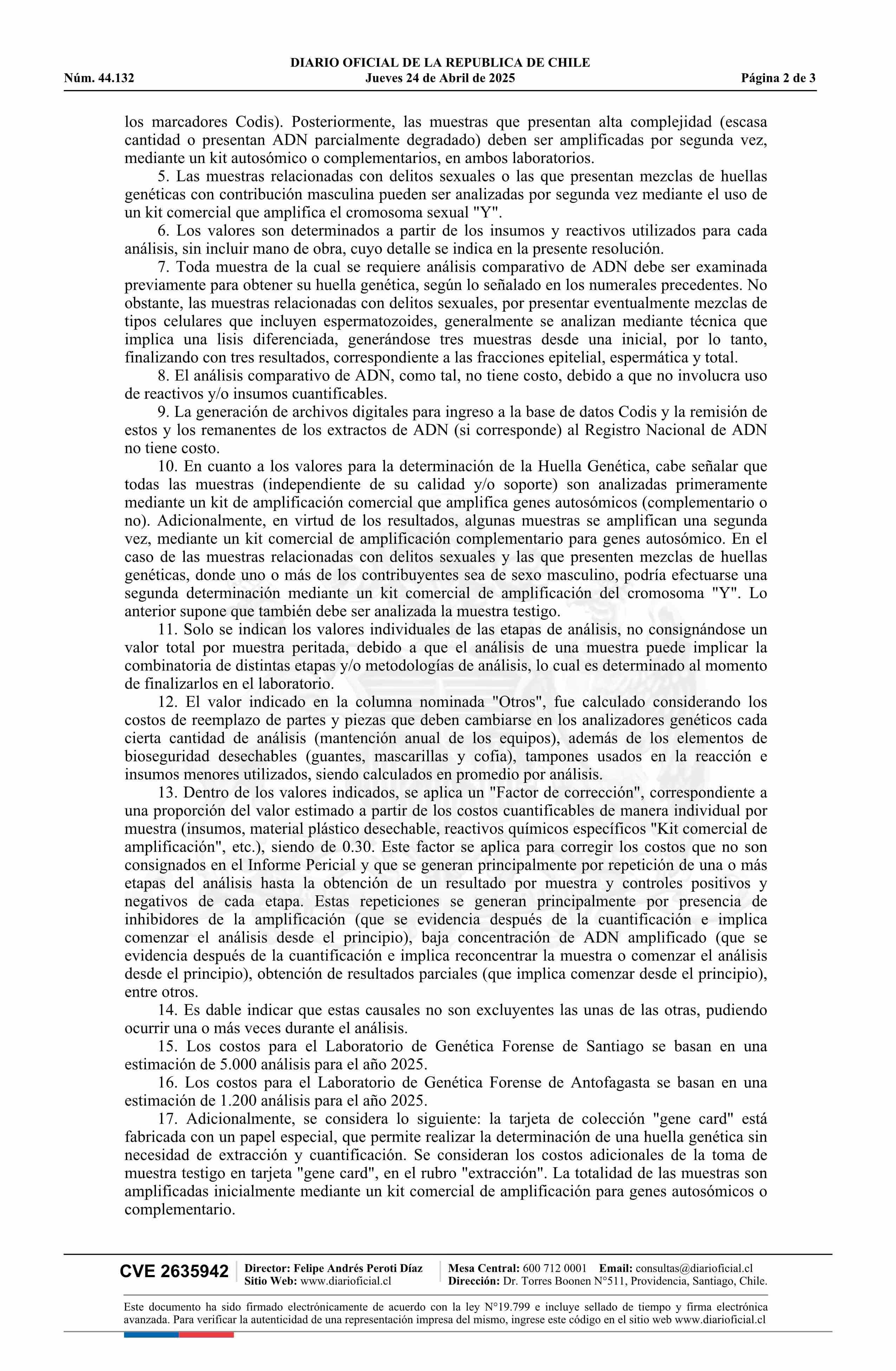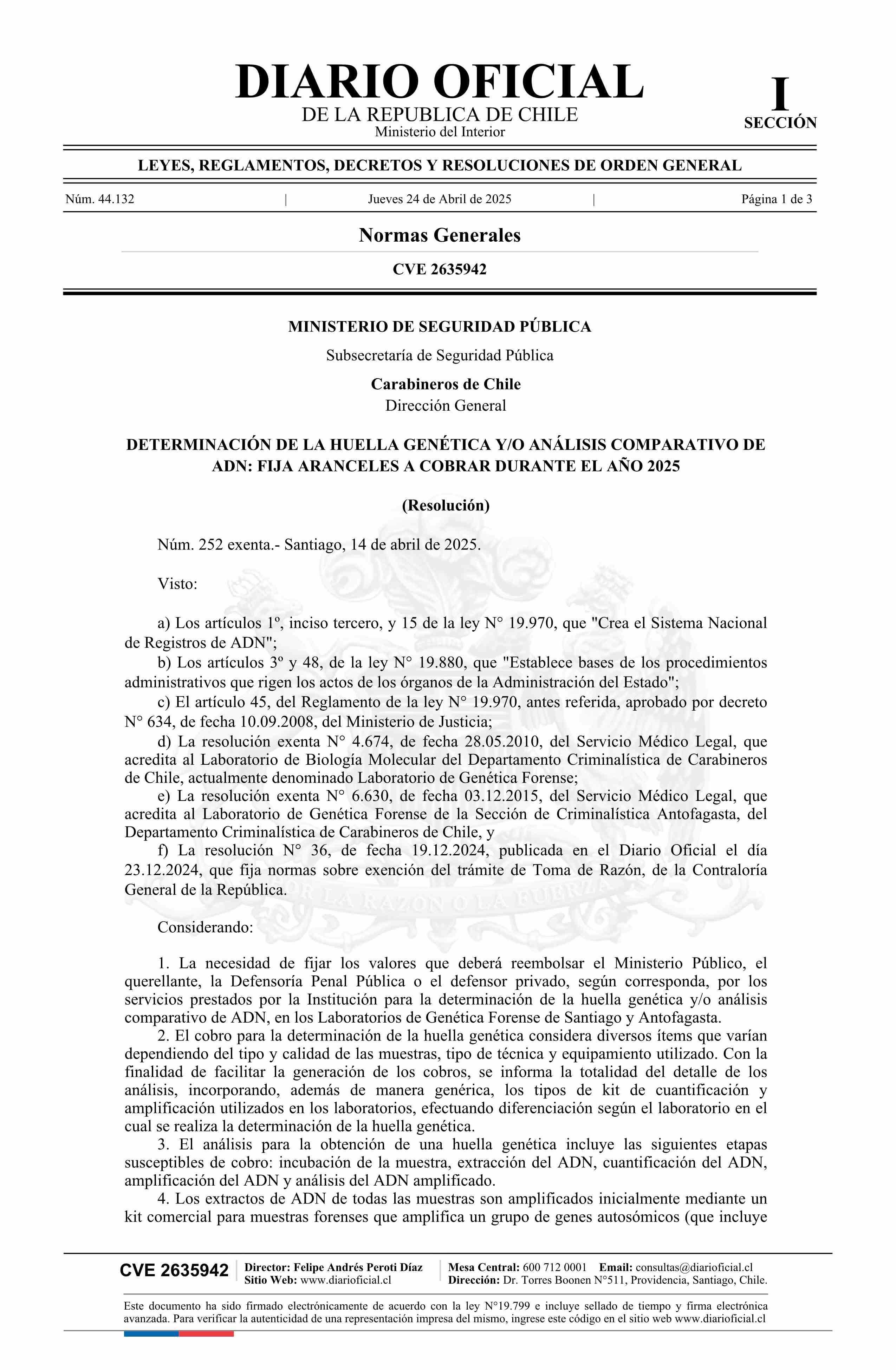 | Título: | Resolución exenta número 252, de 2025.- Determinación de la huella genética y/o análisis comparativo de ADN: Fija aranceles a cobrar durante el año 2025 |