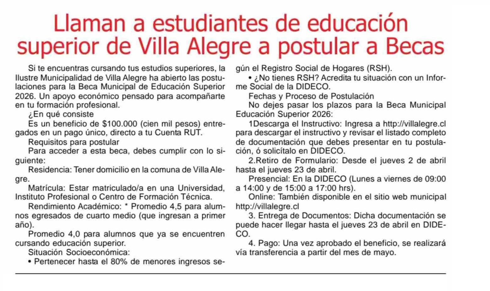 Título: Llaman a estudiantes de educación superior de Villa Alegre a postular a Becas