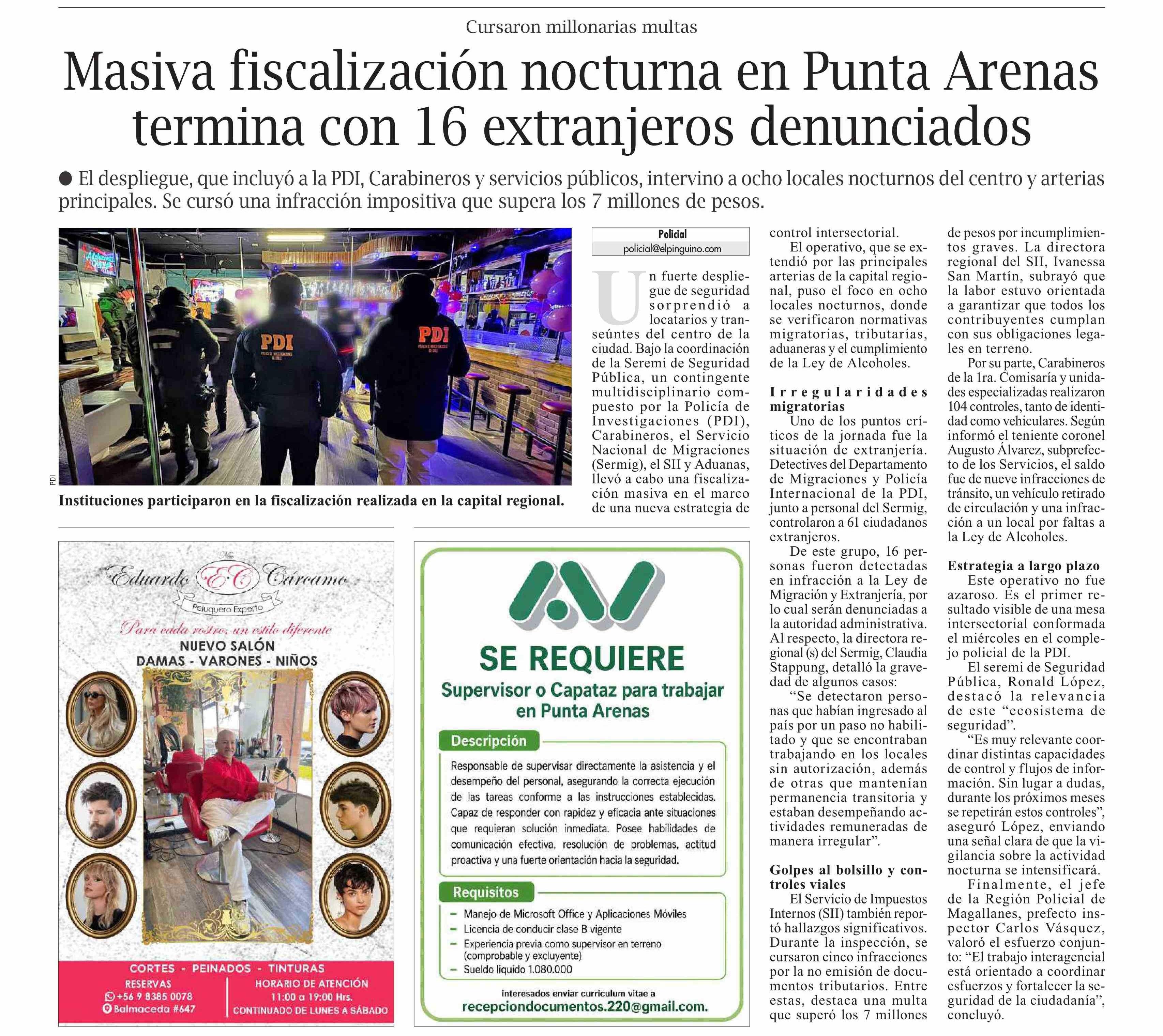 Masiva fiscalización nocturna en Punta Arenas termina con 16 extranjeros denunciados 26-04-2026 El Pingüino |