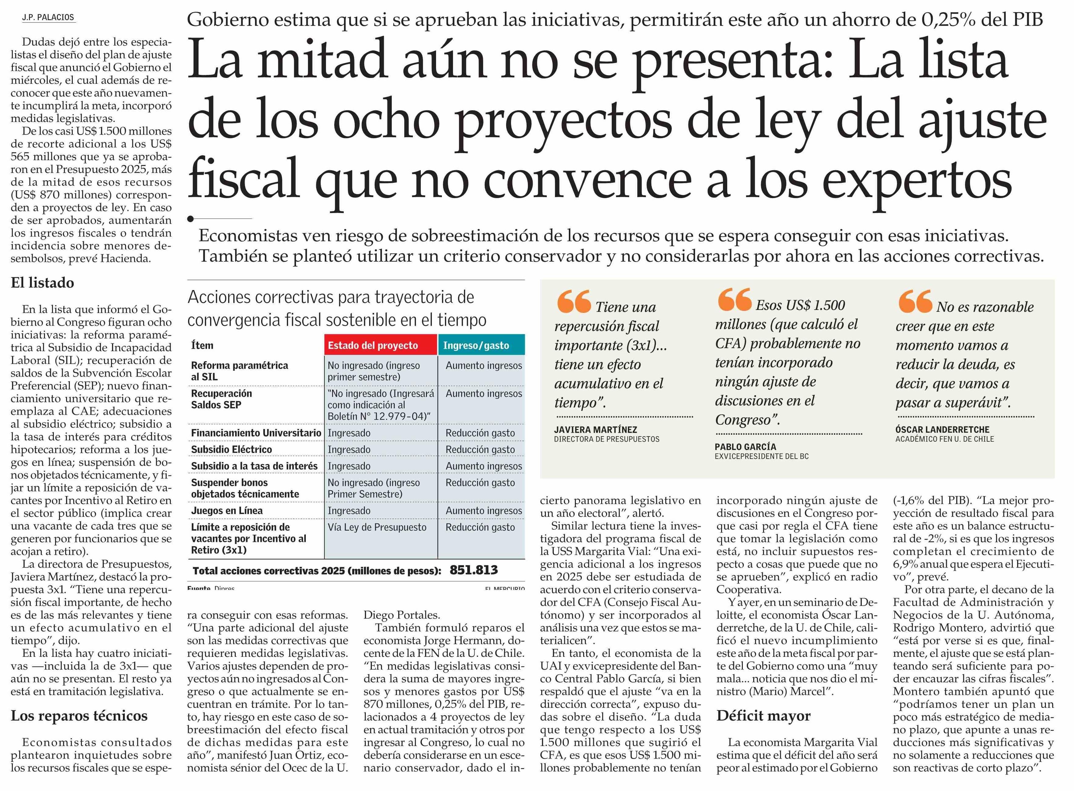 La mitad aún no se presenta: La lista de los ocho proyectos de ley del ajuste fiscal que no convence a los expertos 25-04-2025 El Mercurio |