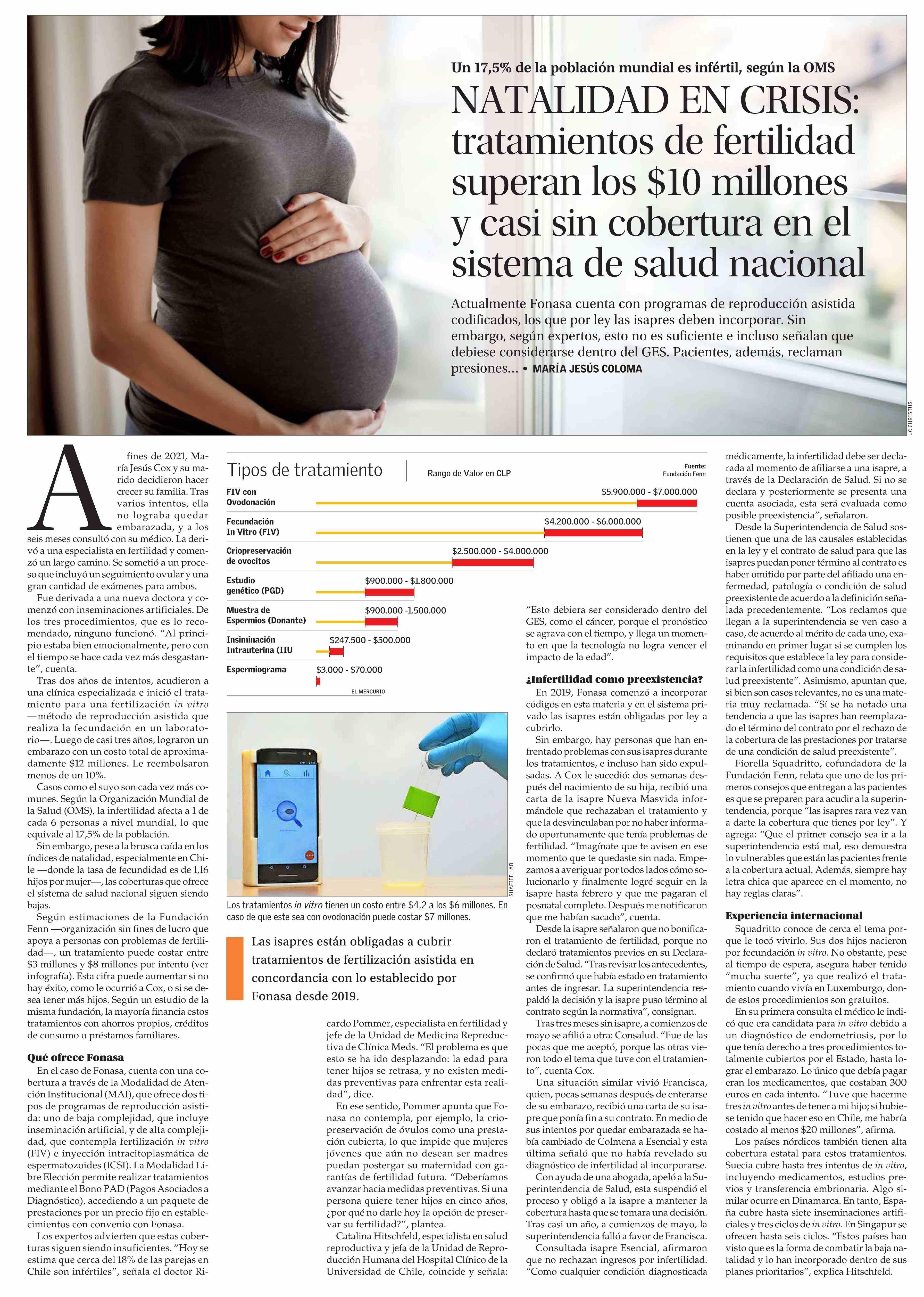 NATALIDAD EN CRISIS: tratamientos de fertilidad superan los $10 millones y Casi sin cobertura en el sistema de salud nacional 11-05-2025 El Mercurio |
