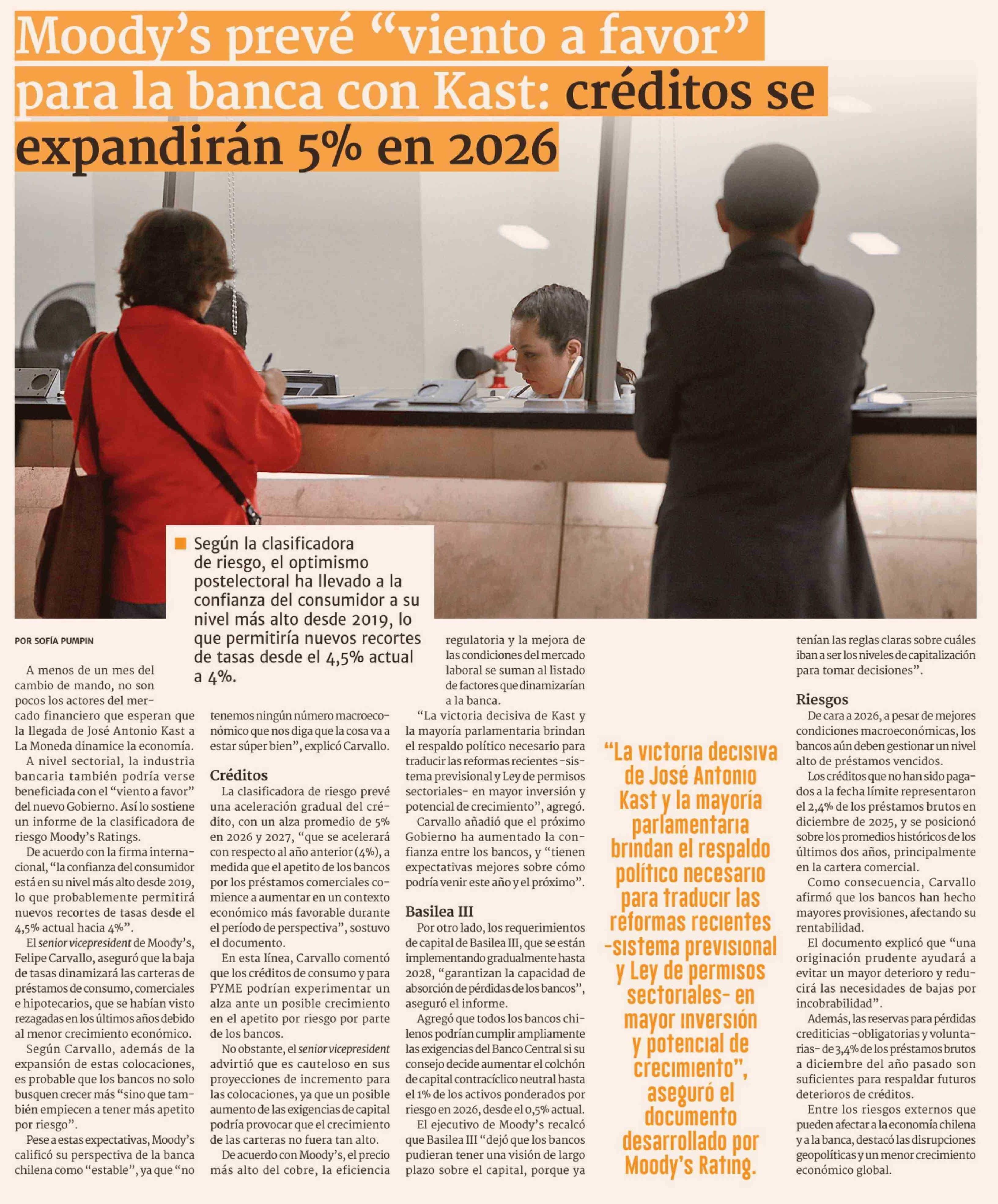 | Título: | Moody's prevé "viento a favor para la banca con Kast: créditos se expandirán 5% en 2026 |