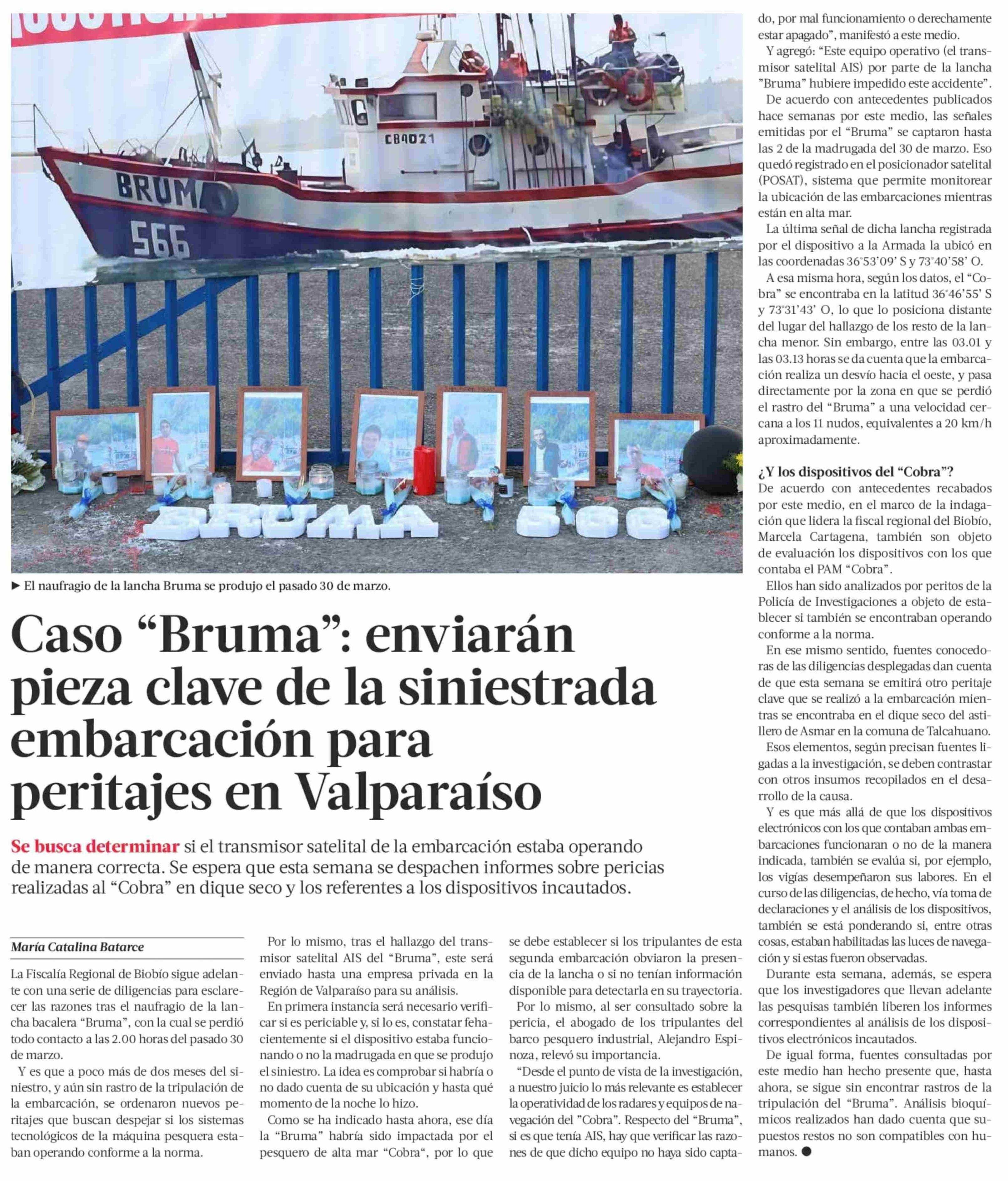 Caso “Bruma”: enviarán pieza clave de la siniestrada embarcación para peritajes en Valparaíso 10-06-2025 La Tercera |