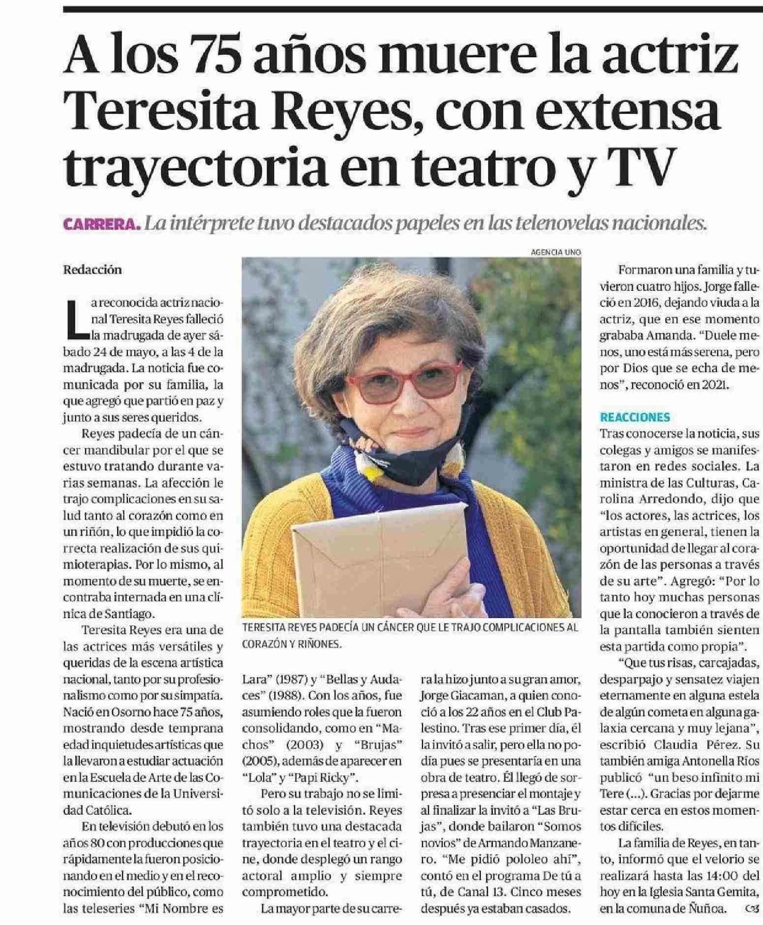 Alos 75 años muere la actriz Teresita Reyes, con extensa trayectoria en teatro y TV 25-05-2025 El Diario de Atacama |