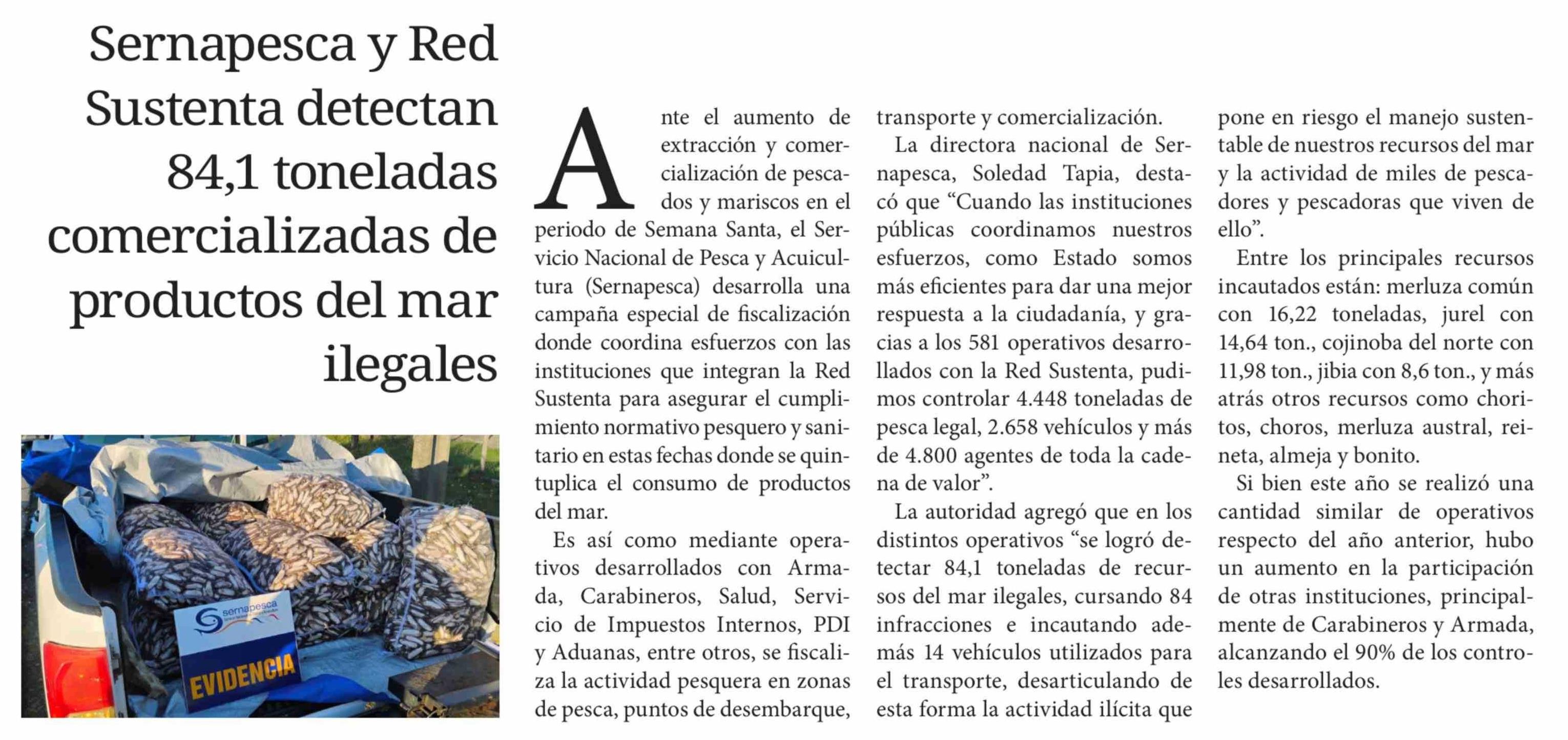 Sernapesca y Red Sustenta detectan 84,1 toneladas comercializadas de productos del mar ilegales 10-04-2026 Diario Chañarcillo |