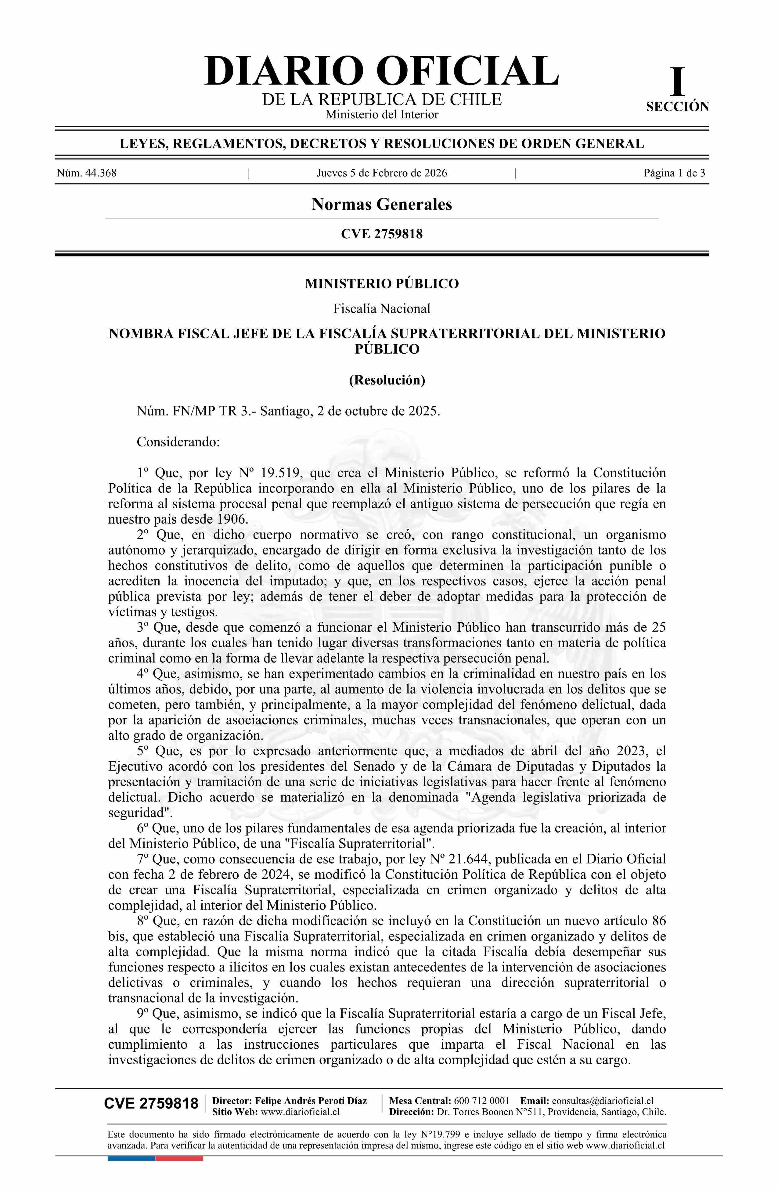 Resolución número TR 3, de 2025.- Nombra a don Miguel Ángel Orellana Pérez en el cargo de Fiscal Jefe de la Fiscalía Supraterritorial 05-02-2026 Diario Oficial Edición Electrónica |