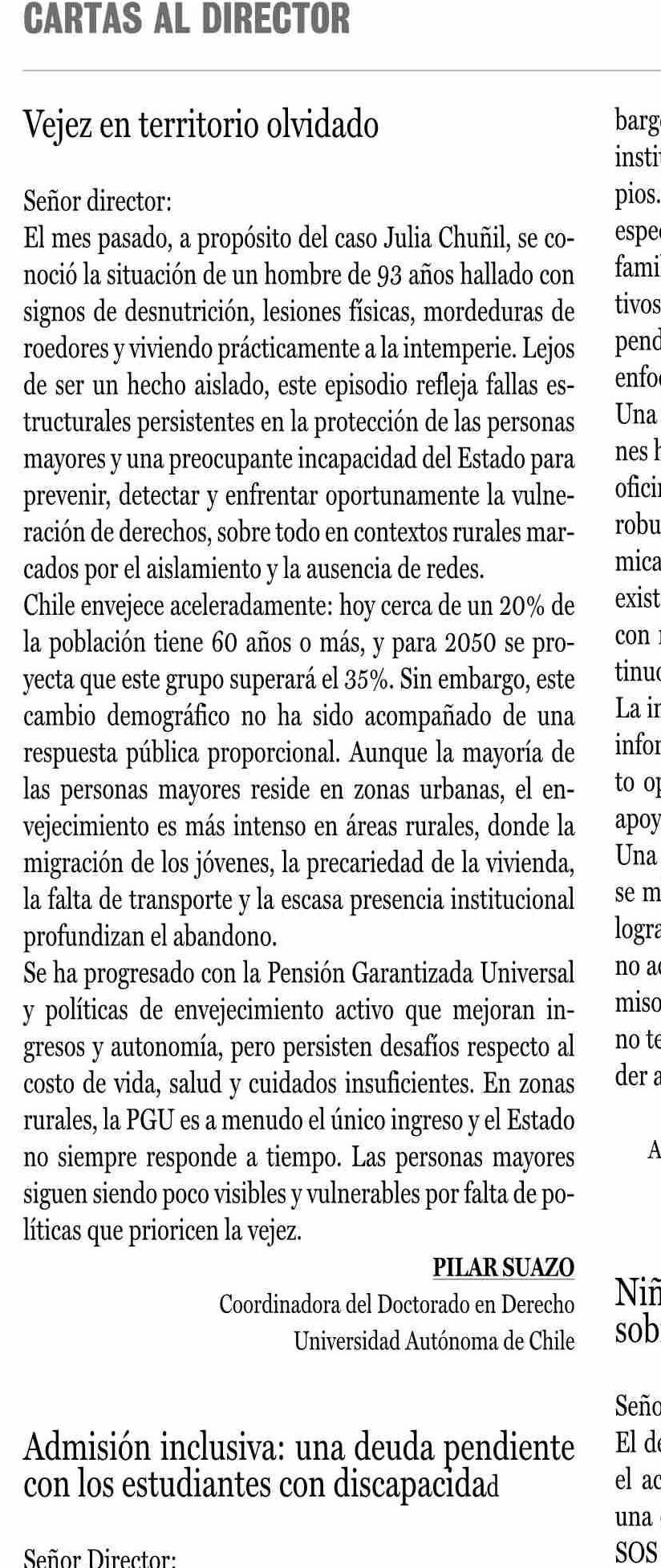 Cartas: Vejez en territorio olvidado 07-02-2026 La Prensa de Curicó |