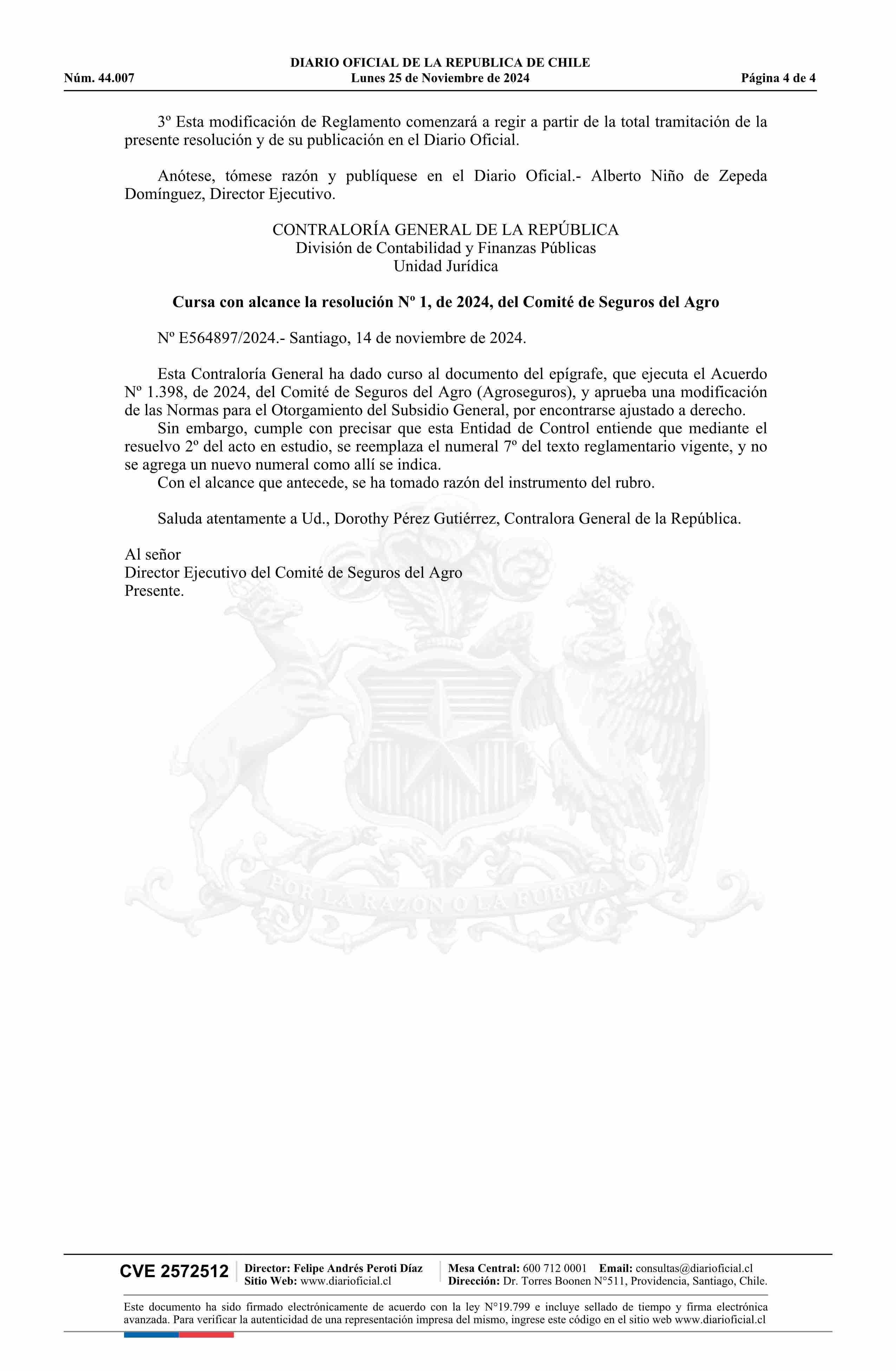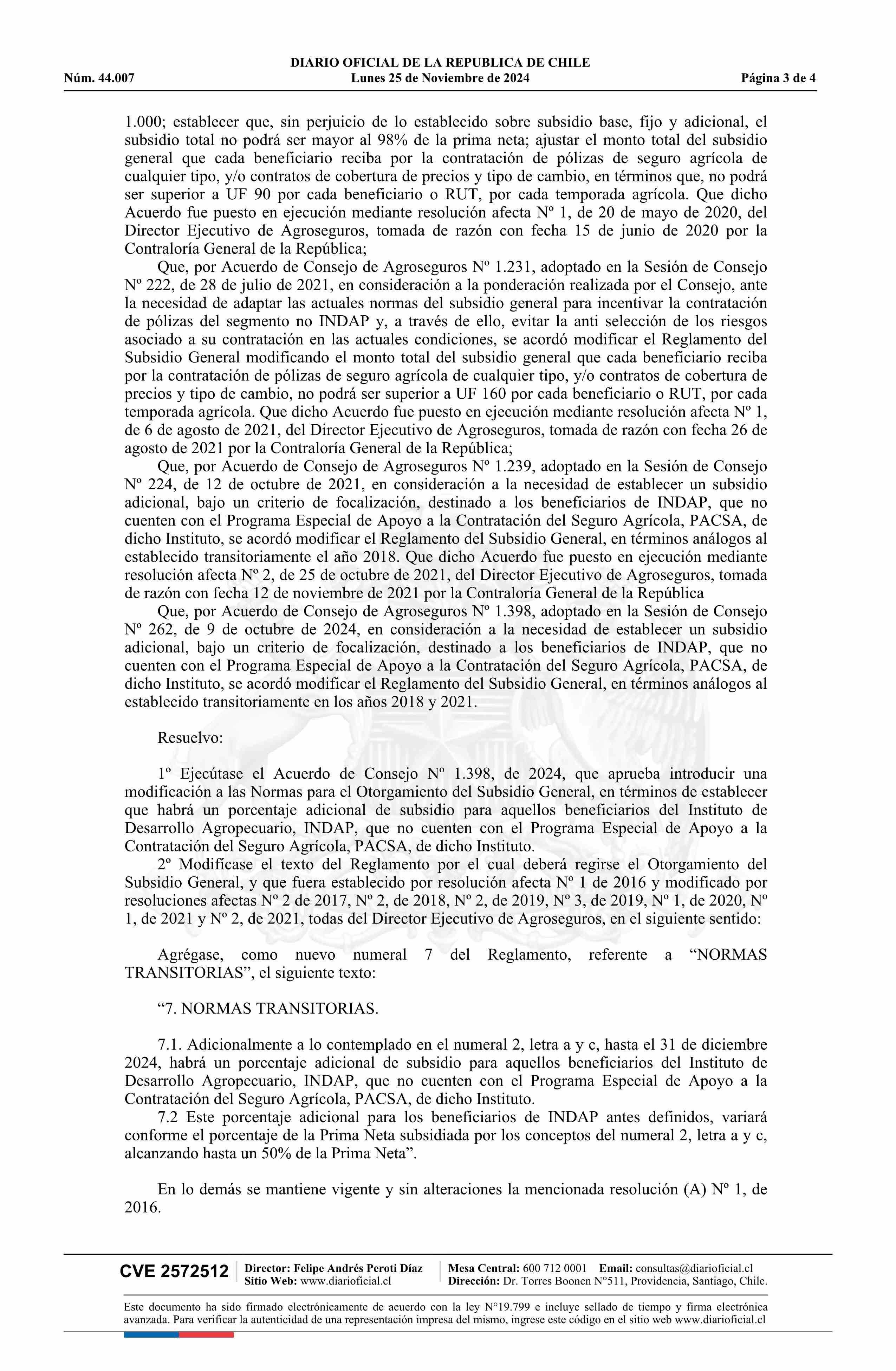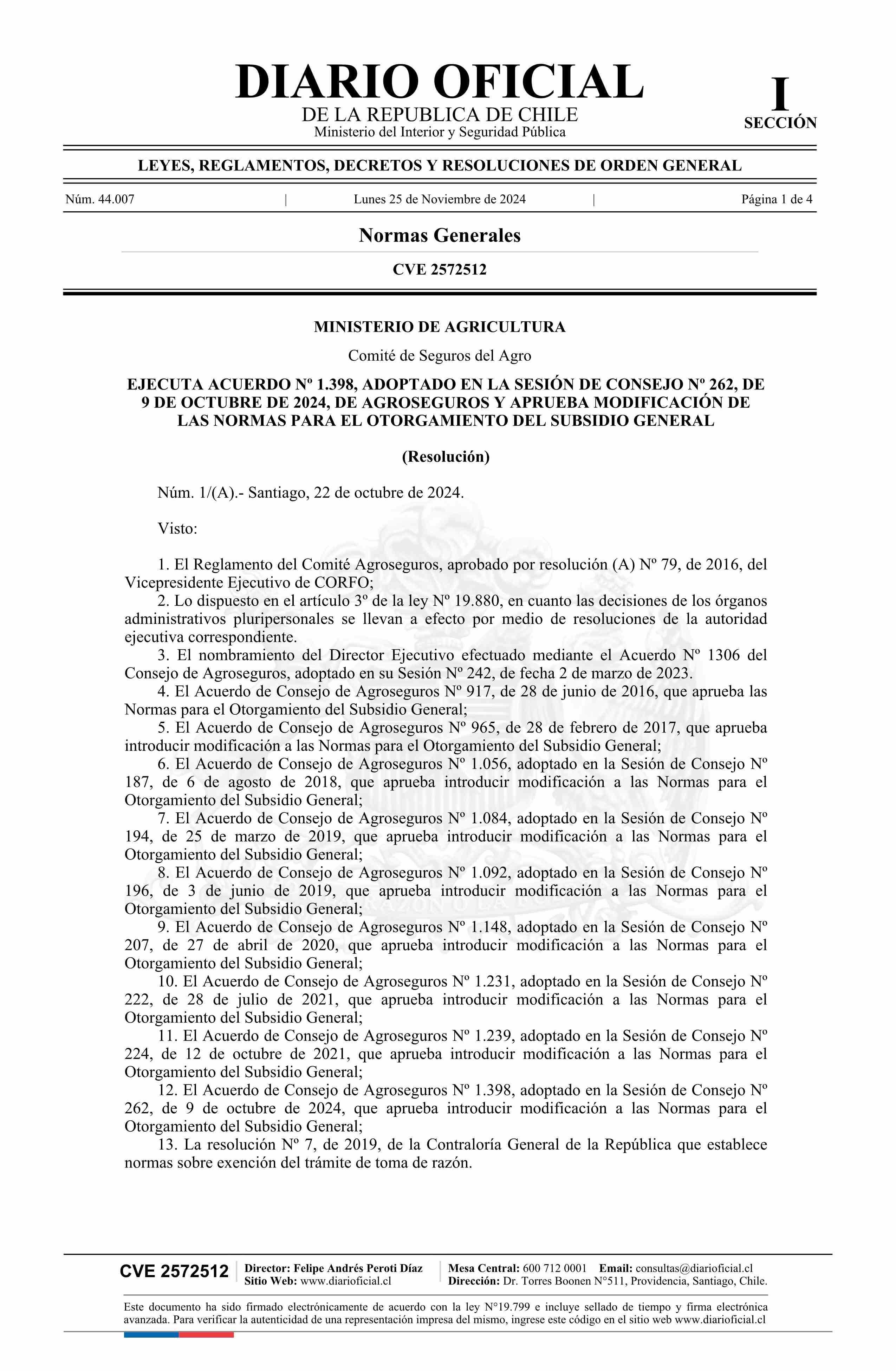 Resolución número 1/(A), de 2024.- Ejecuta acuerdo Nº 1.398, adoptado en la sesión de Consejo Nº 262, de 2024, de Agroseguros, y aprueba modificación de las normas para el otorgamiento del subsidio general 25-11-2024 DIARIO OFICIAL CHILE - BOLETÍN OFICIAL DE MINERÍA |