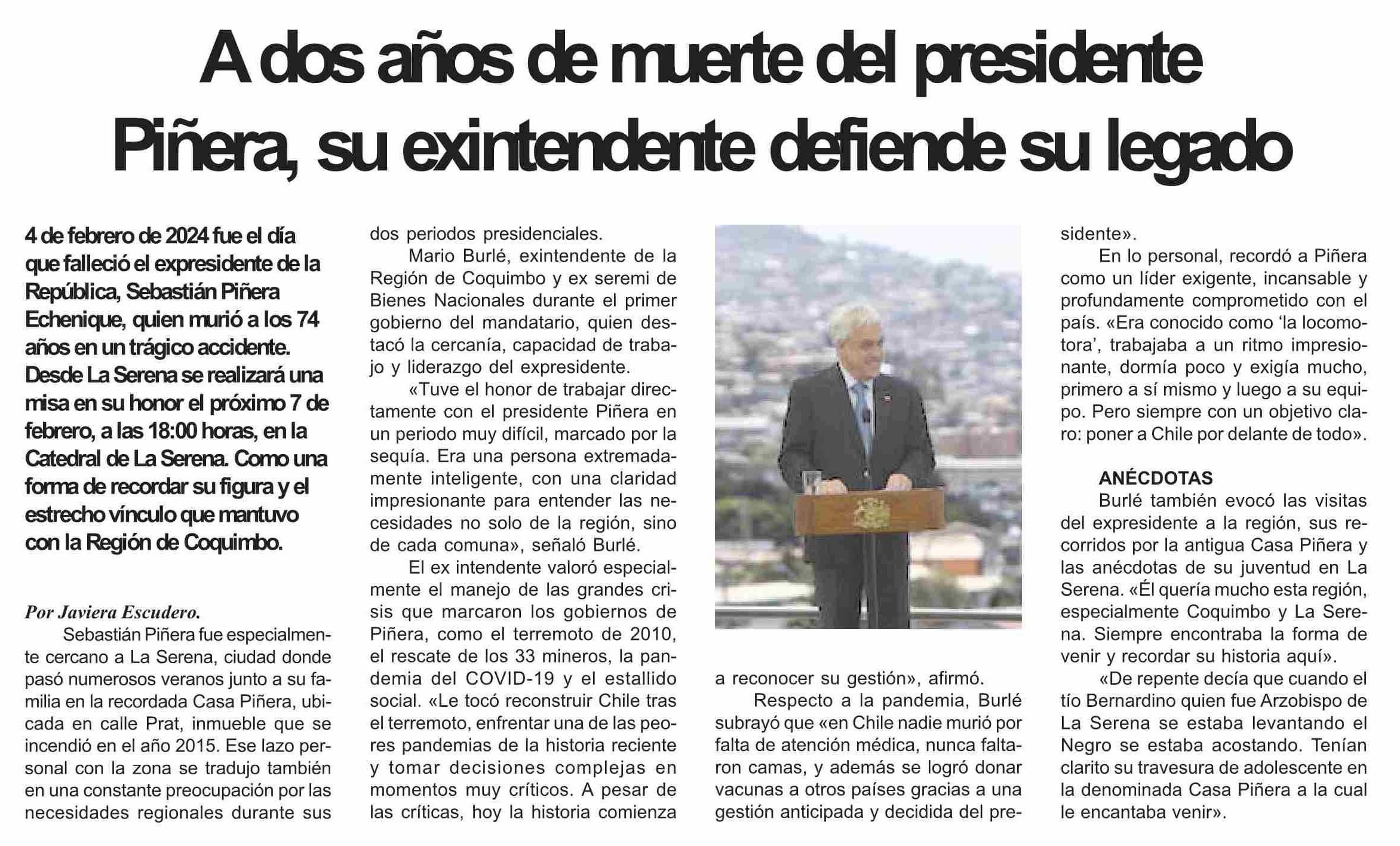 A dos años de muerte del presidente Piñera, su exintendente defiende su legado 06-02-2026 Diario la Región |