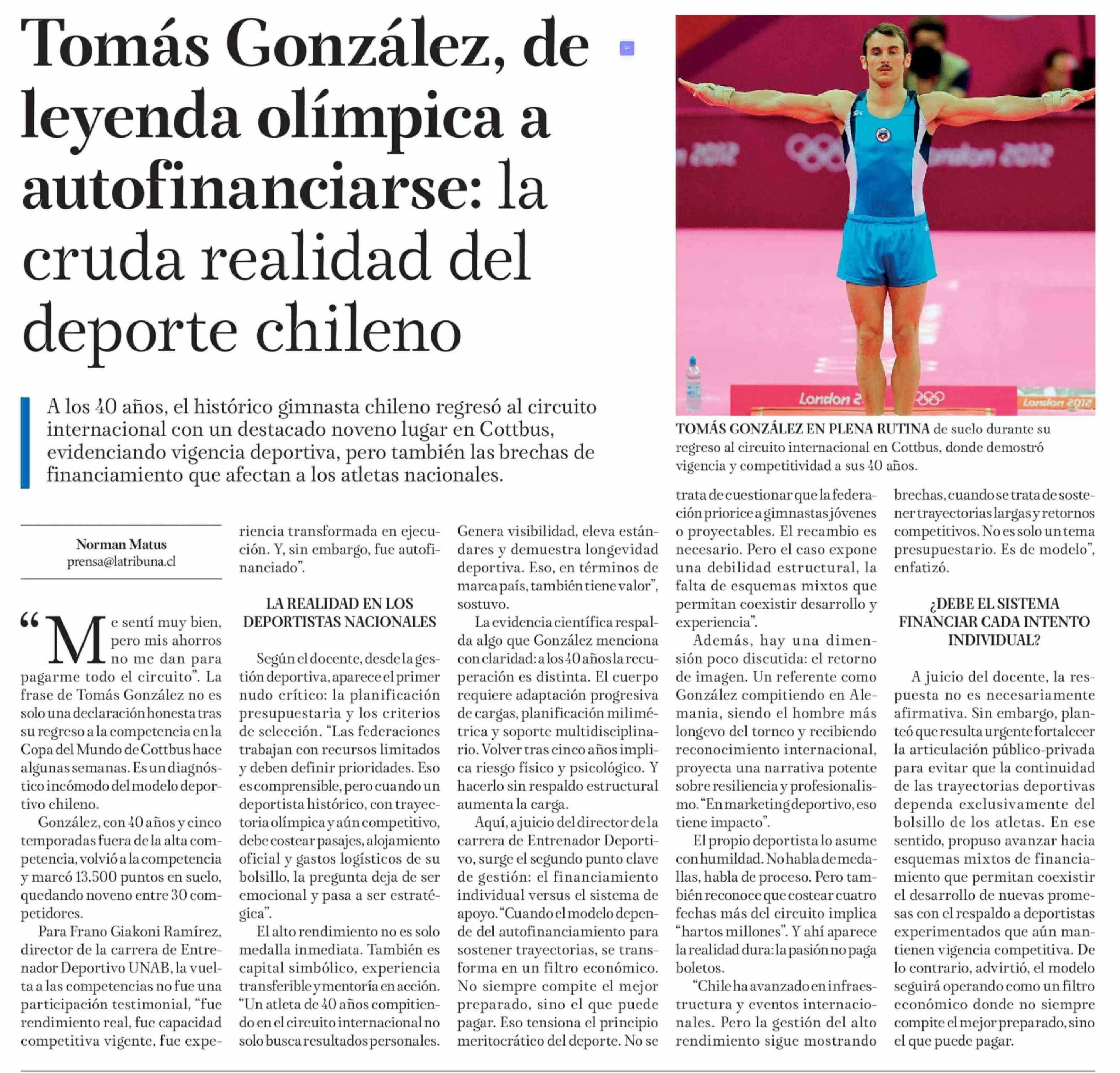 Tomás González, de leyenda olímpica a autofinanciarse: la cruda realidad del deporte chileno 01-04-2026 La Tribuna |