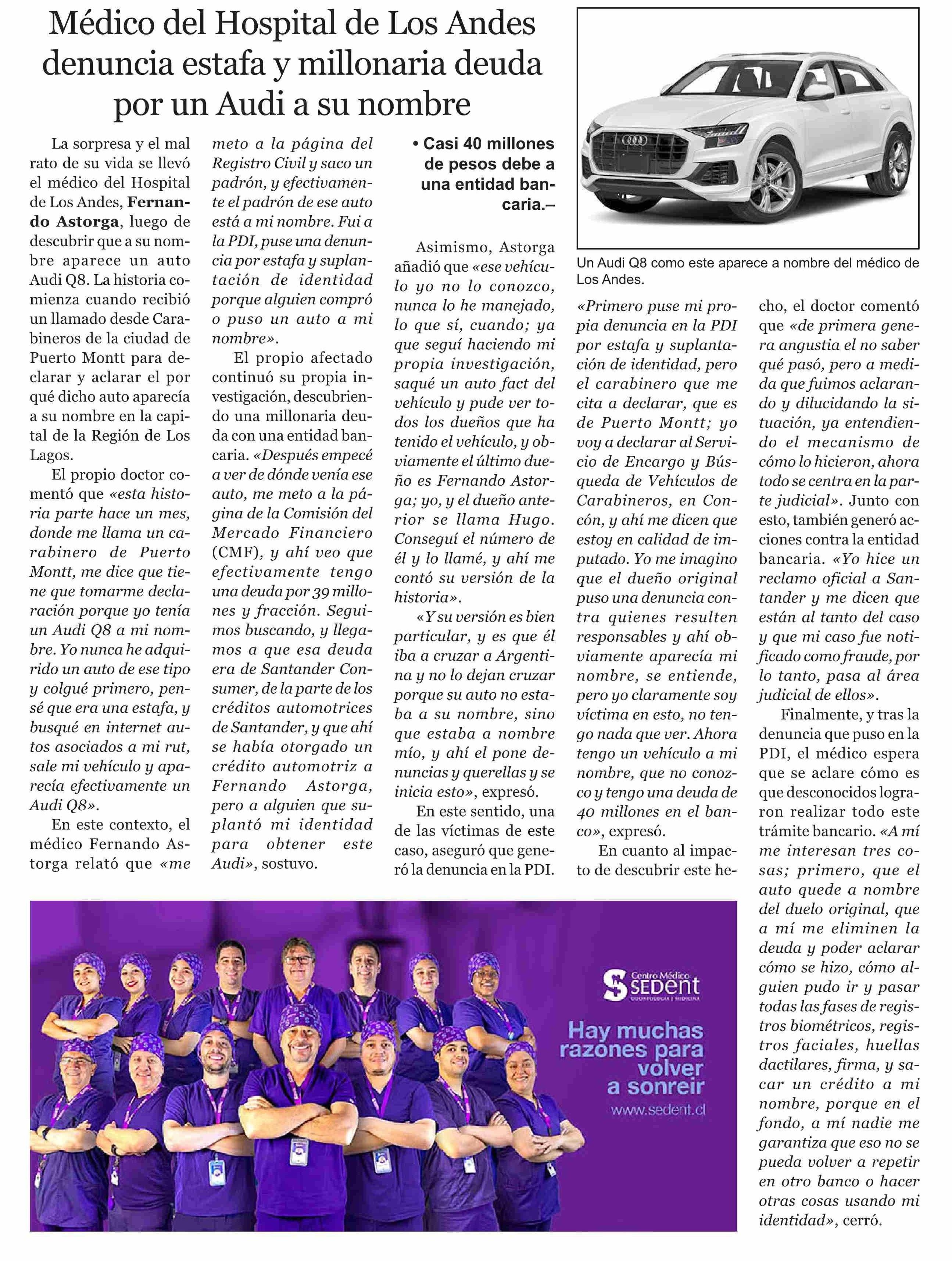 | Título: | Médico del Hospital de Los Andes denuncia estafa y millonaria deuda por un Audi a su nombre |