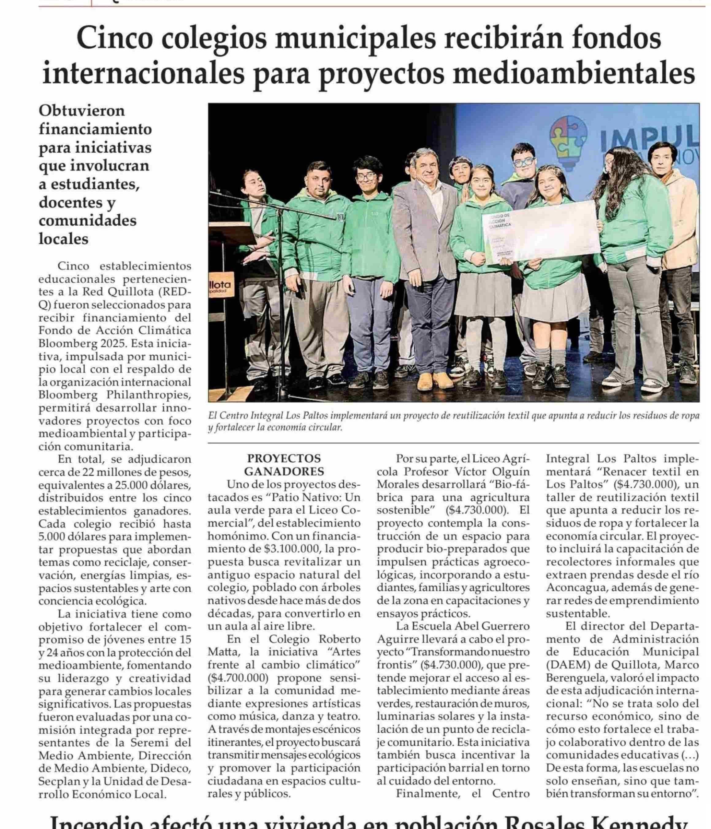 | Título: | Cinco colegios municipales recibirán fondos internacionales para proyectos medioambientales |