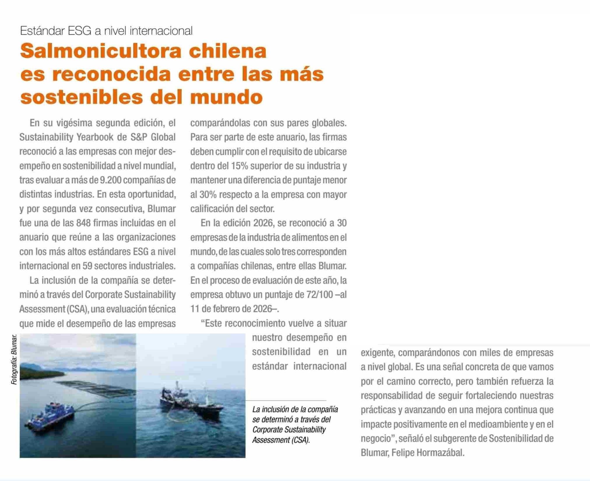 Salmonicultora chilena es reconocida entre las más sostenibles del mundo 12-03-2026 Revista Aqua |