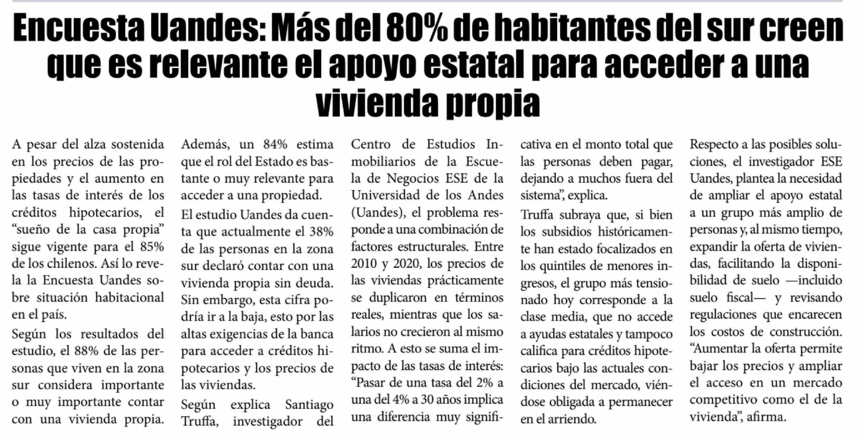 | Título: | Encuesta Uandes: Más del 80% de habitantes del sur creen que es relevante el apoyo estatal para acceder a una vivienda propia |