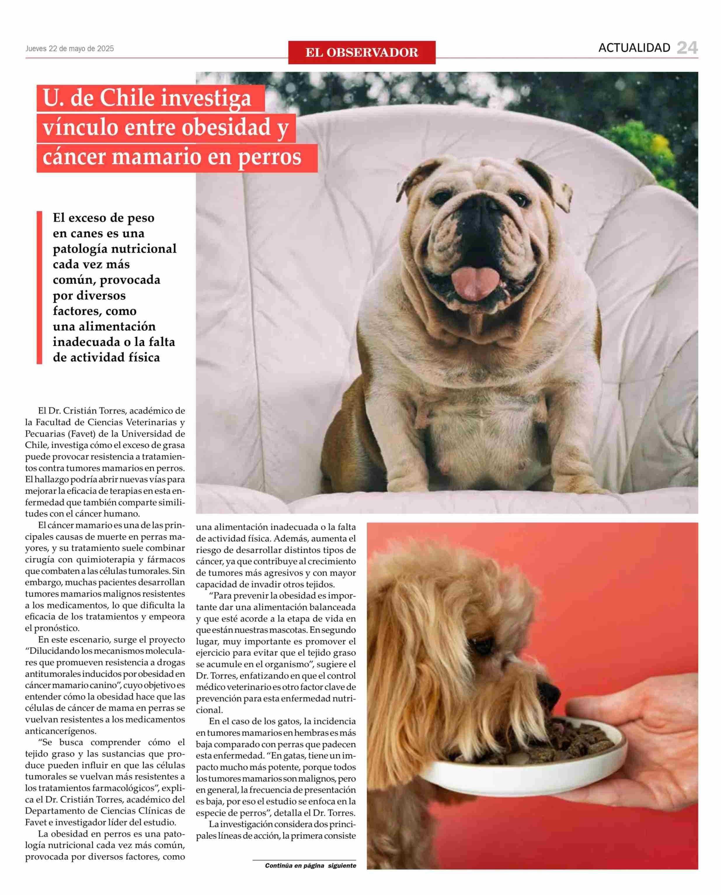 U. de Chile investi entre obesidad y cancer mamario en perros 22-05-2025 El Observador Vespertino |