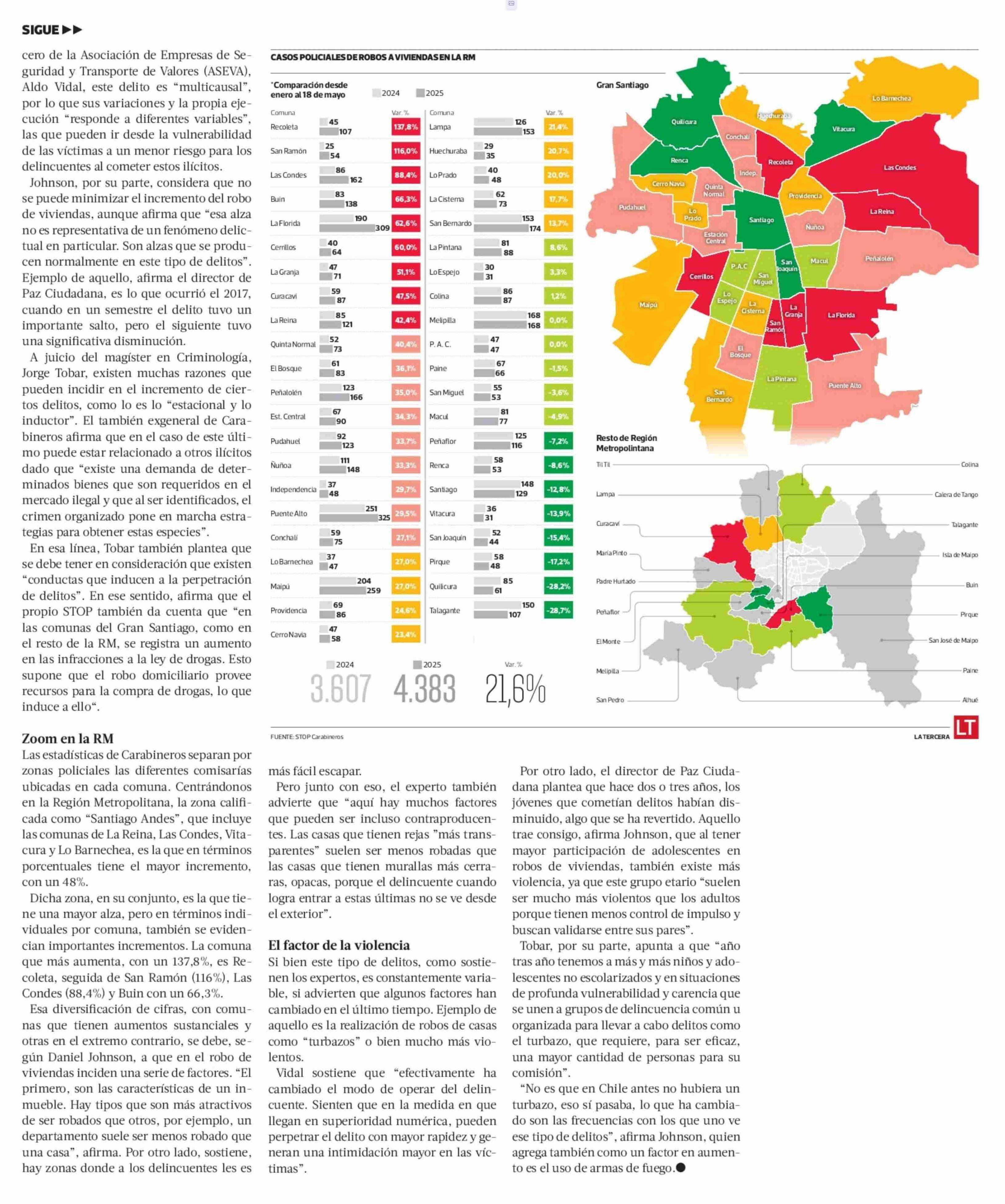 Robos a viviendas aumentan 21,6% en la Región Metropolitana durante los primeros cinco meses del año 26-05-2025 La Tercera |