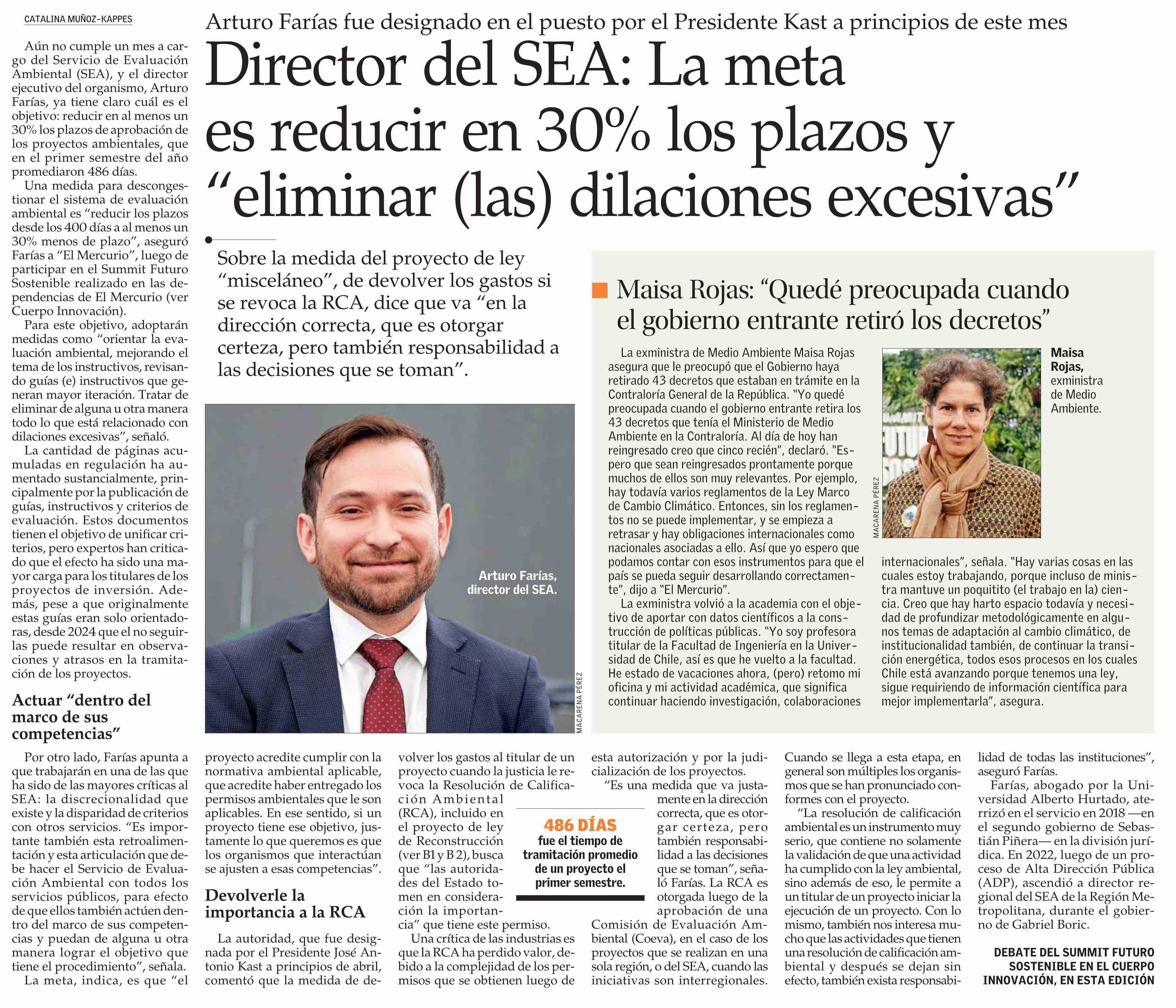 Director del SEA: La meta es reducir en 30% los plazos y “eliminar (las) dilaciones excesivas” 23-04-2026 El Mercurio |