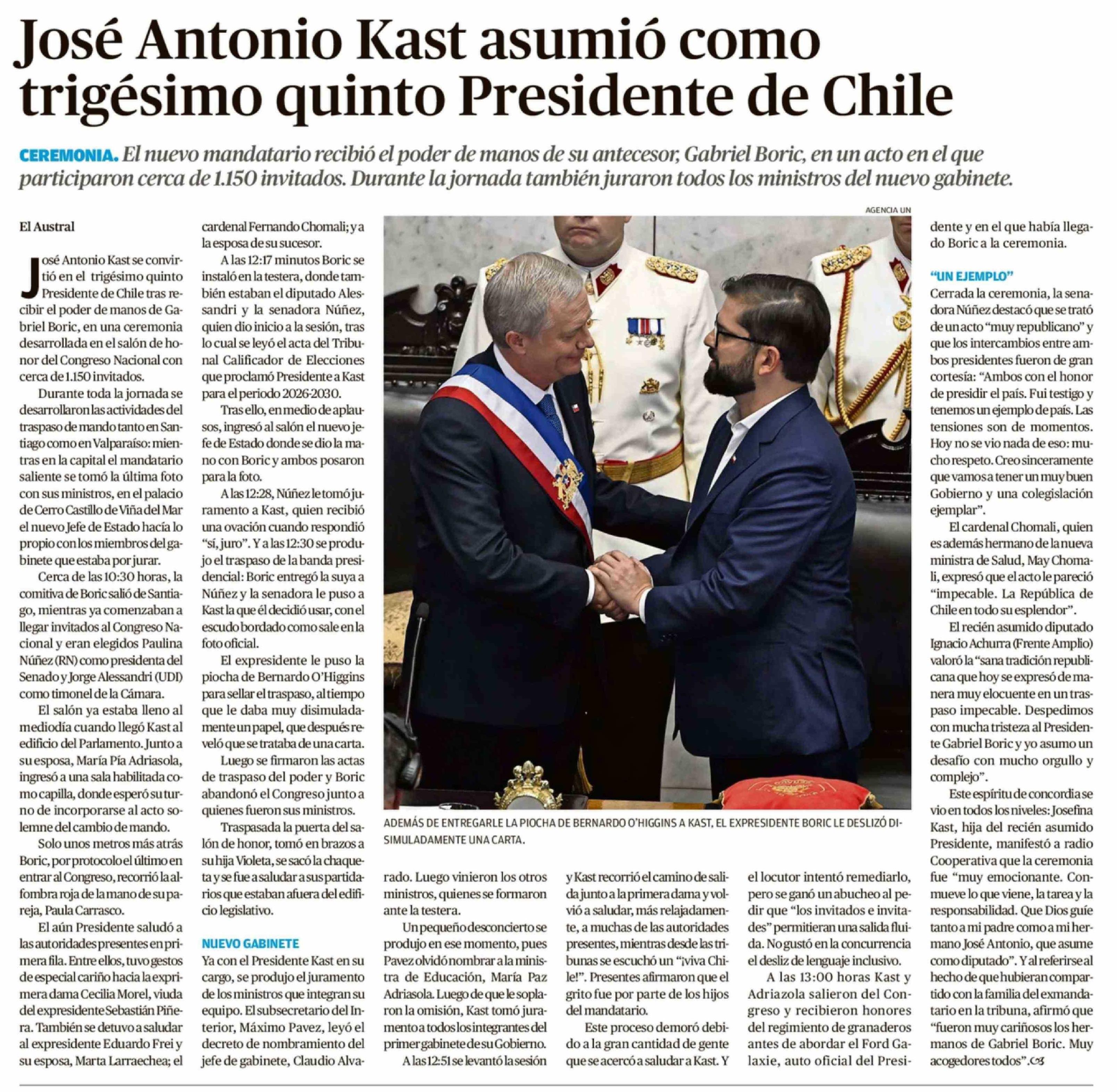 Título: José Antonio Kast asumió como trigésimo quinto Presidente de Chile
