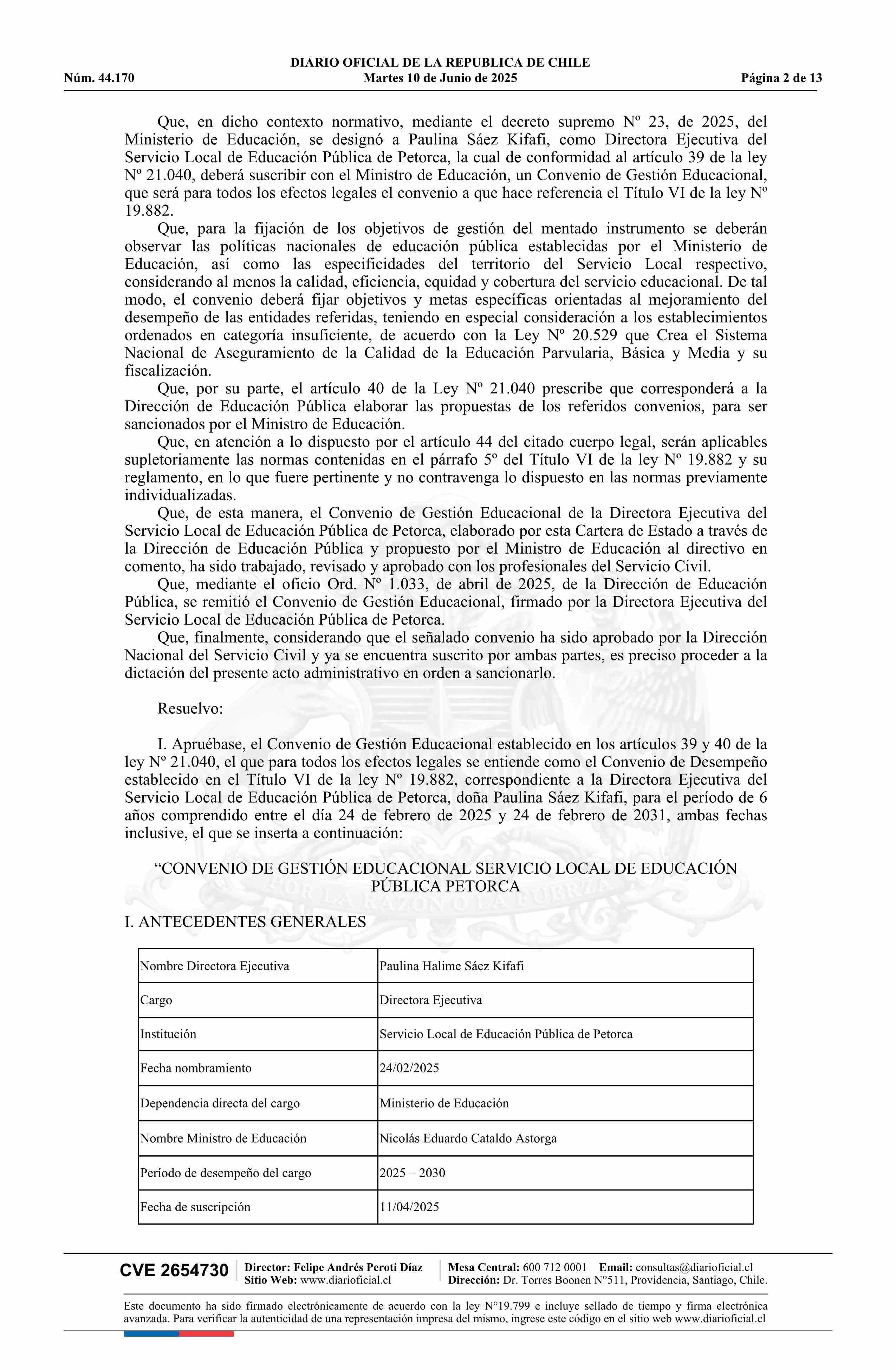 | Título: | Resolución exenta número 7.286, de 2025.- Aprueba el Convenio de desempeño de gestión educacional de la Directora Ejecutiva del Servicio Local de Educación Pública de Petorca |