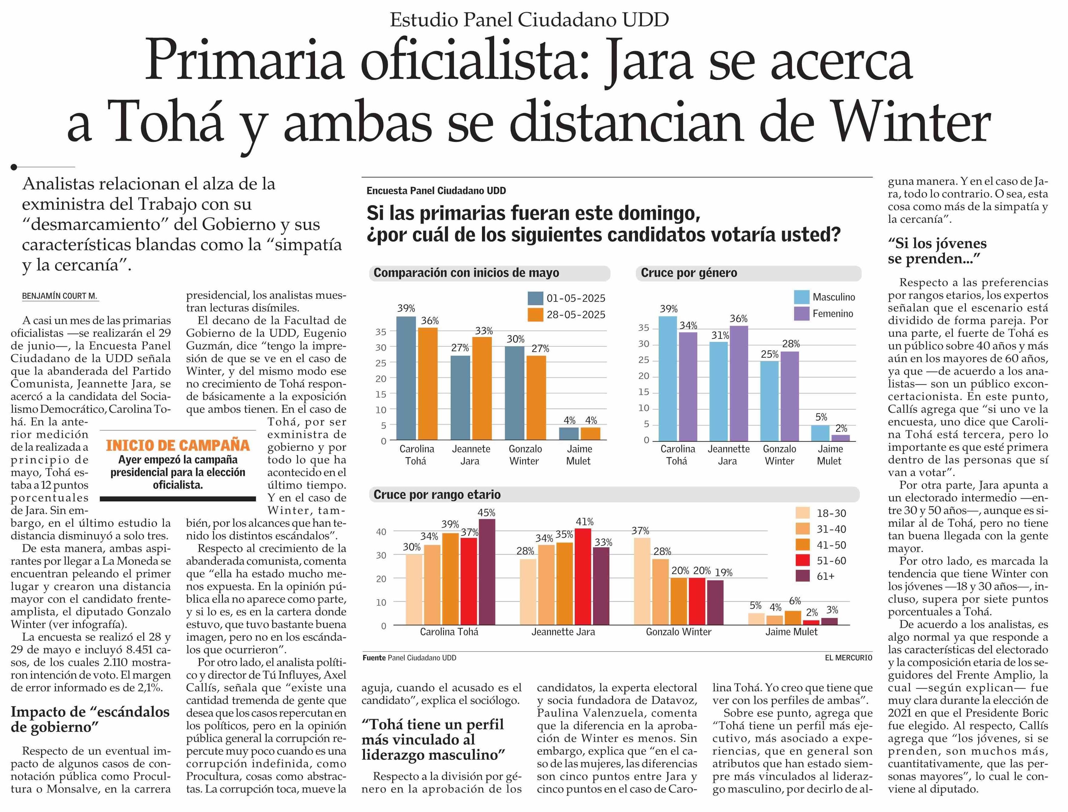 Primaria oficialista: Jara se acerca a Tohá y ambas se distancian de Winter 31-05-2025 El Mercurio |