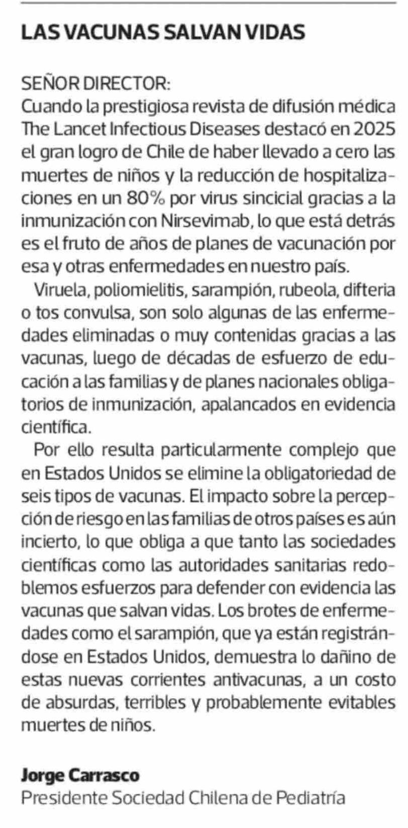Cartas: LAS VACUNAS SALVAN VIDAS 15-01-2026 La Tercera |