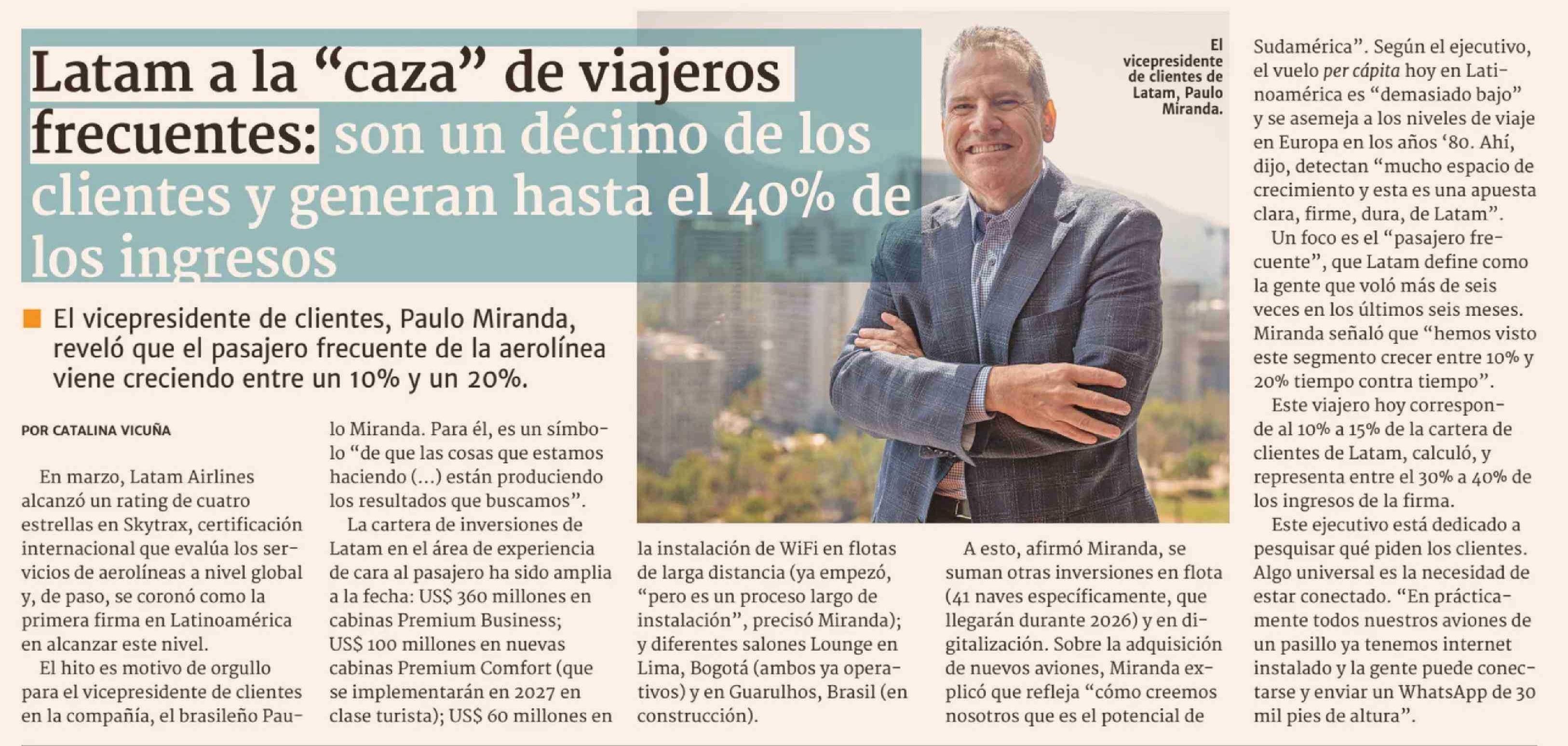 Título: Latam a la "caza" de viajeros frecuentes: son un décimo de los clientes y generan hasta el 40% de los ingresos