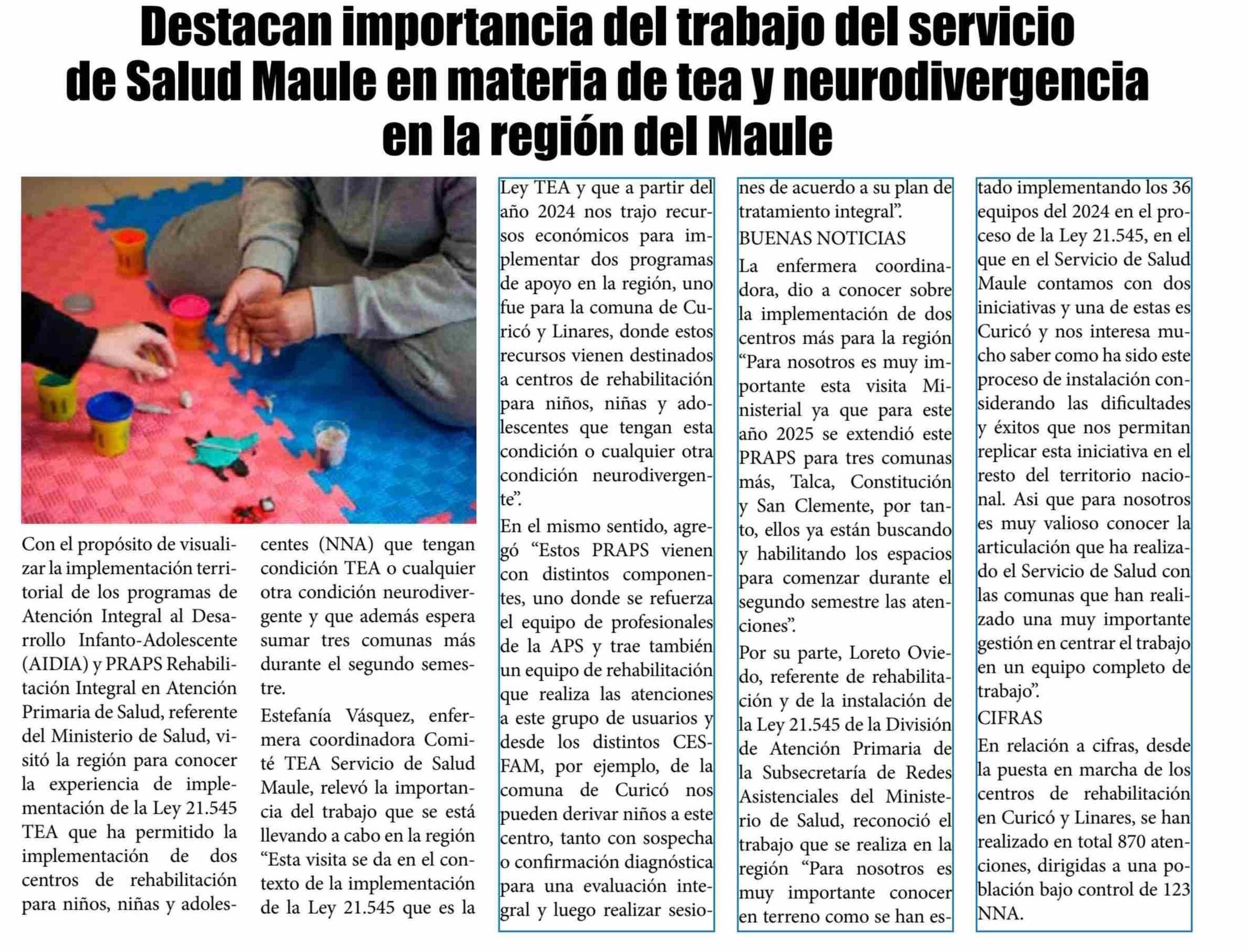 Destacan importancia del trabajo del servicio de Salud Maule en materia de tea y neurodivergencia en la región del Maule 08-06-2025 El Lector |