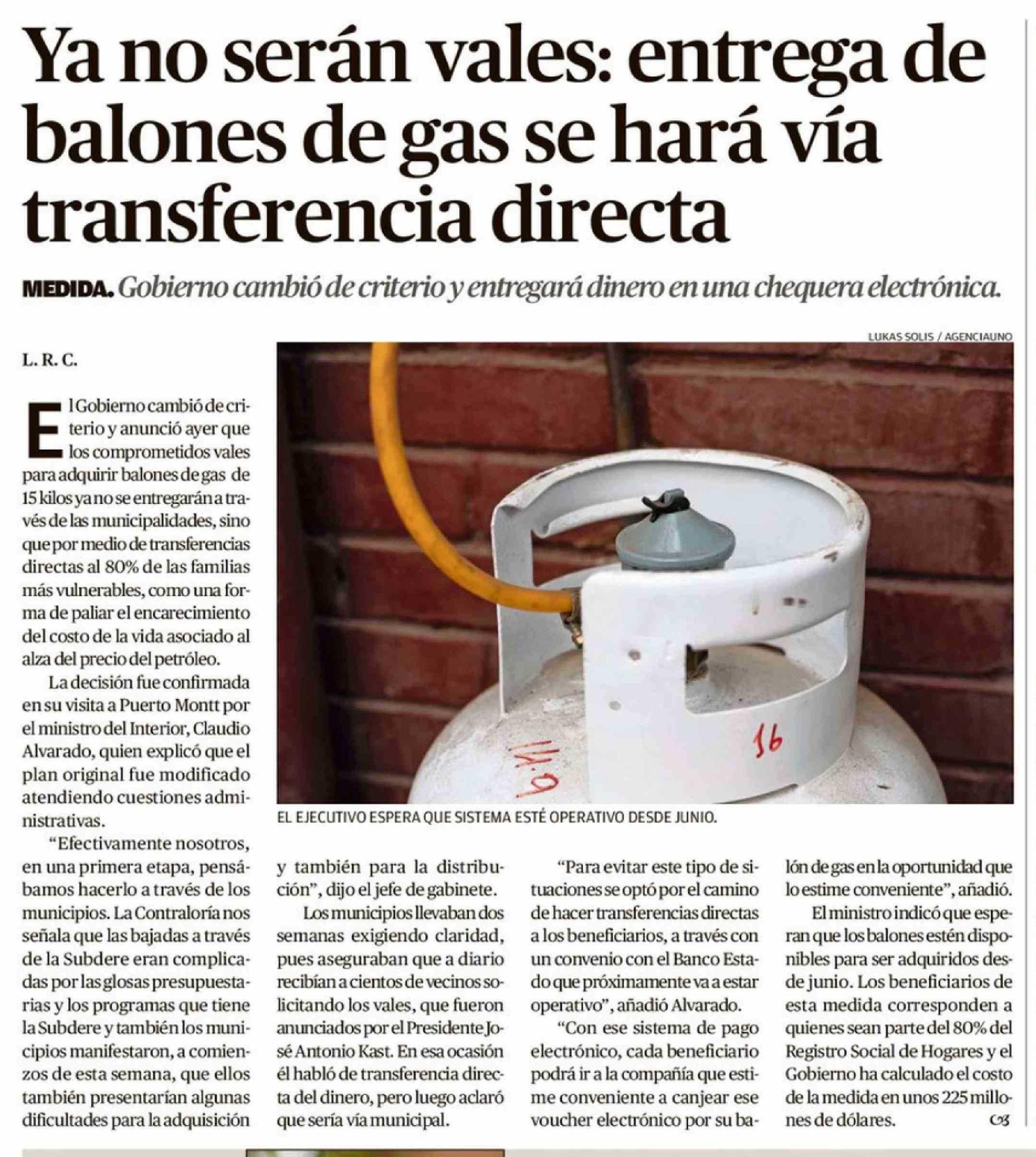 | Título: | Ya no serán vales: entrega de balones de gas se hará vía transferencia directa |