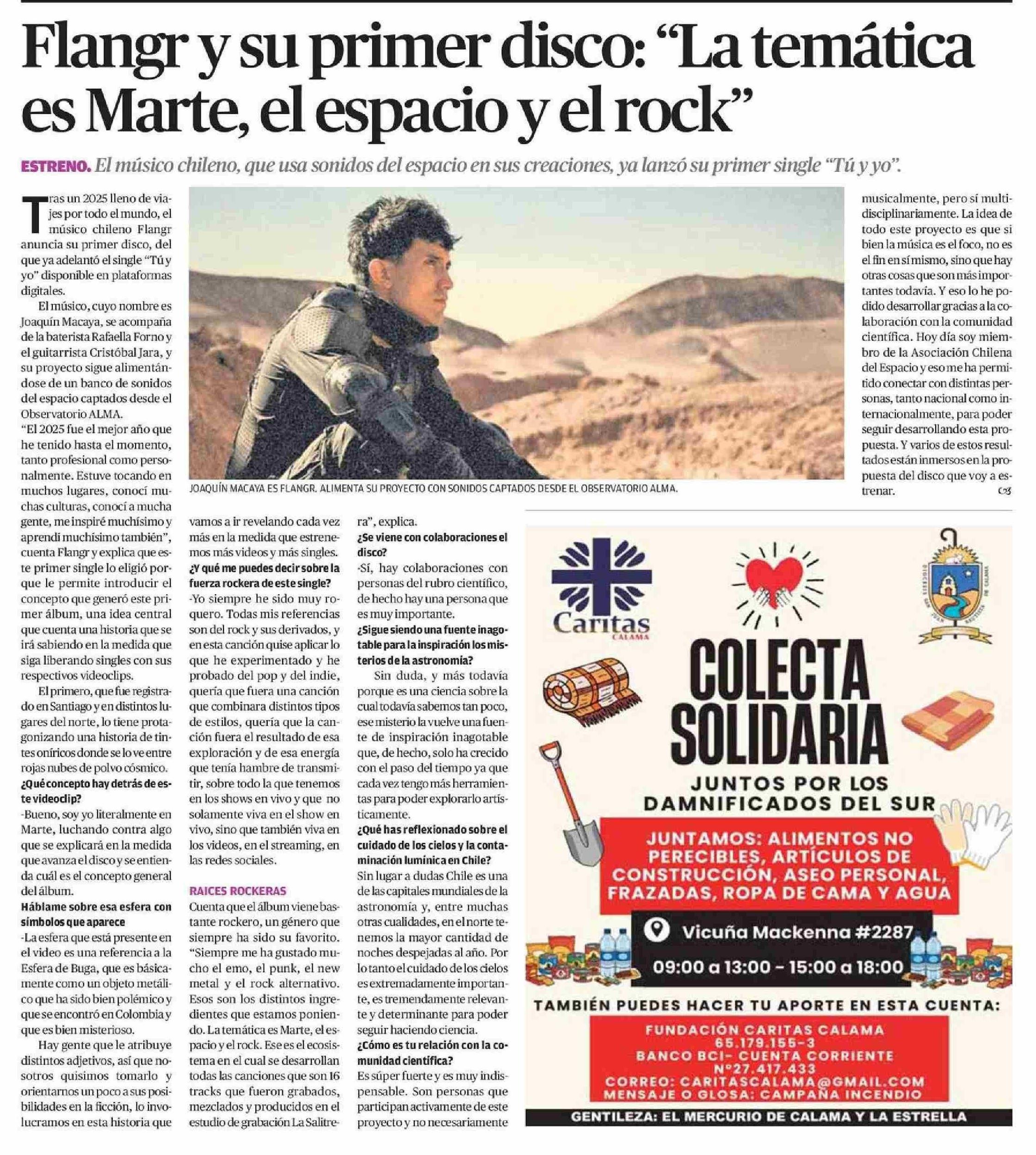 Flangr y su primer disco: "La temática es Marte, el espacio y el rock" 25-01-2026 El Mercurio de Calama |