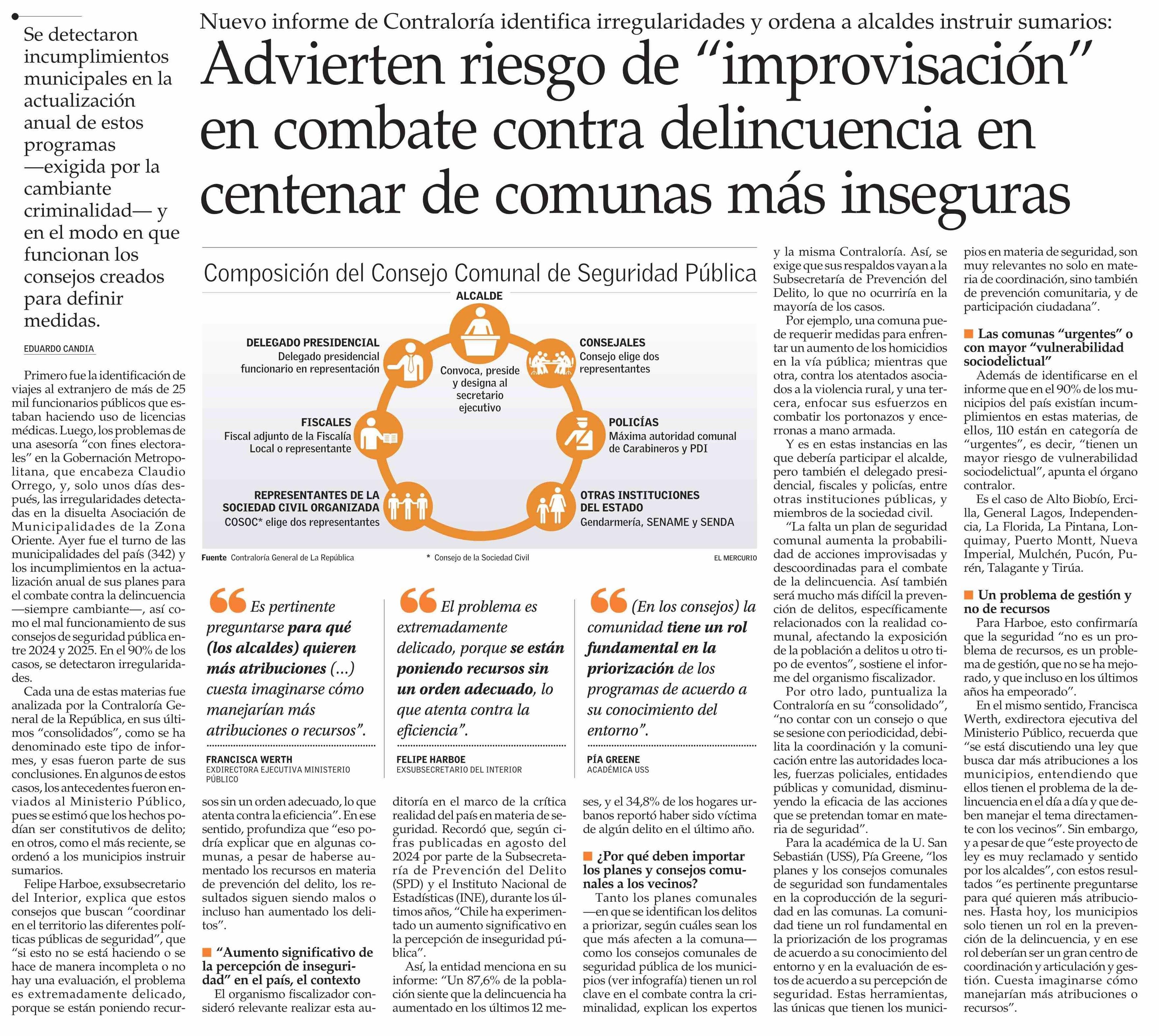 Advierten riesgo de “improvisación” en combate contra delincuencia en centenar de comunas más inseguras 10-06-2025 El Mercurio |