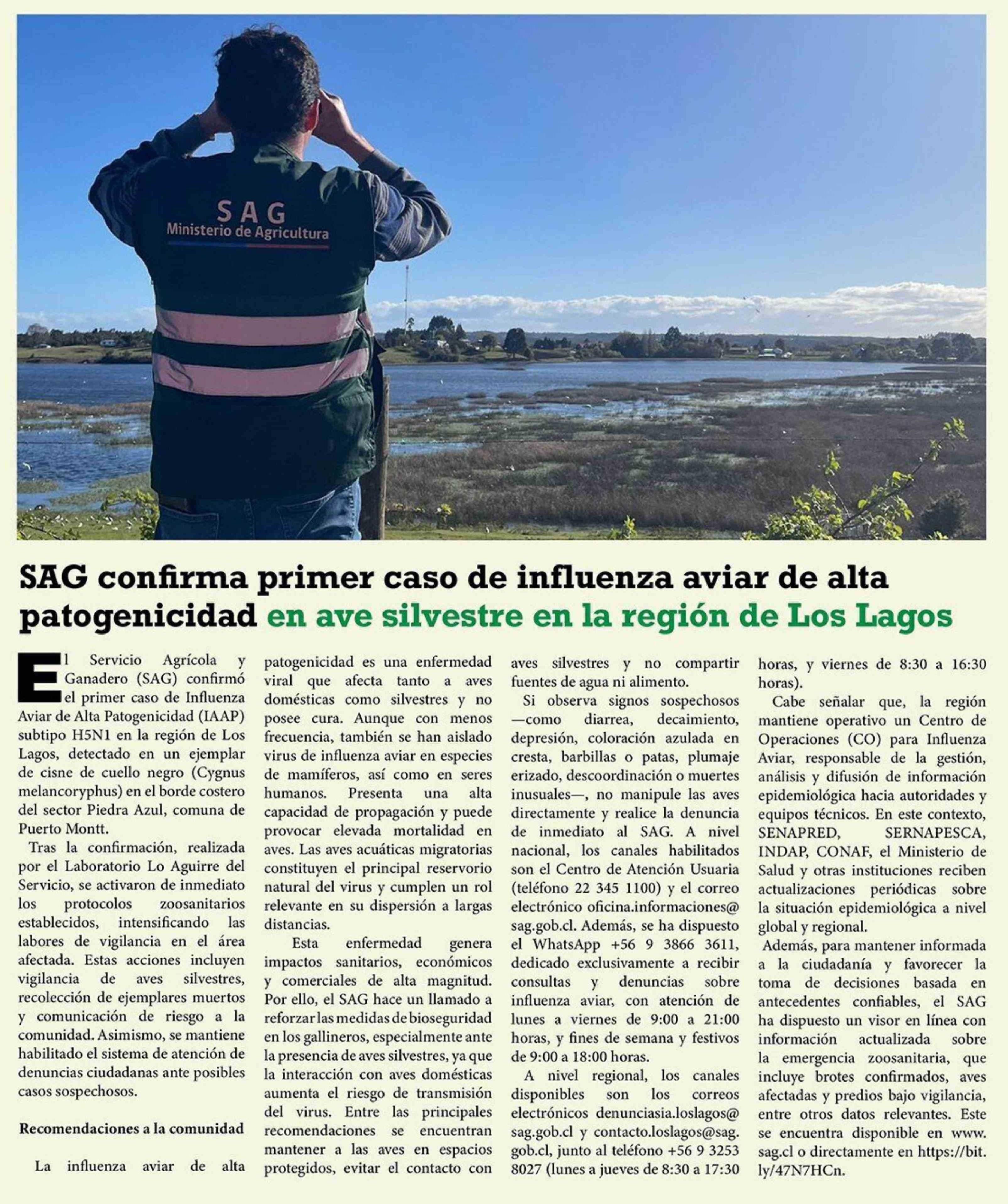 | Título: | SAG confirma primer caso de influenza aviar de alta patogenicidad en ave silvestre en la región de Los Lagos |