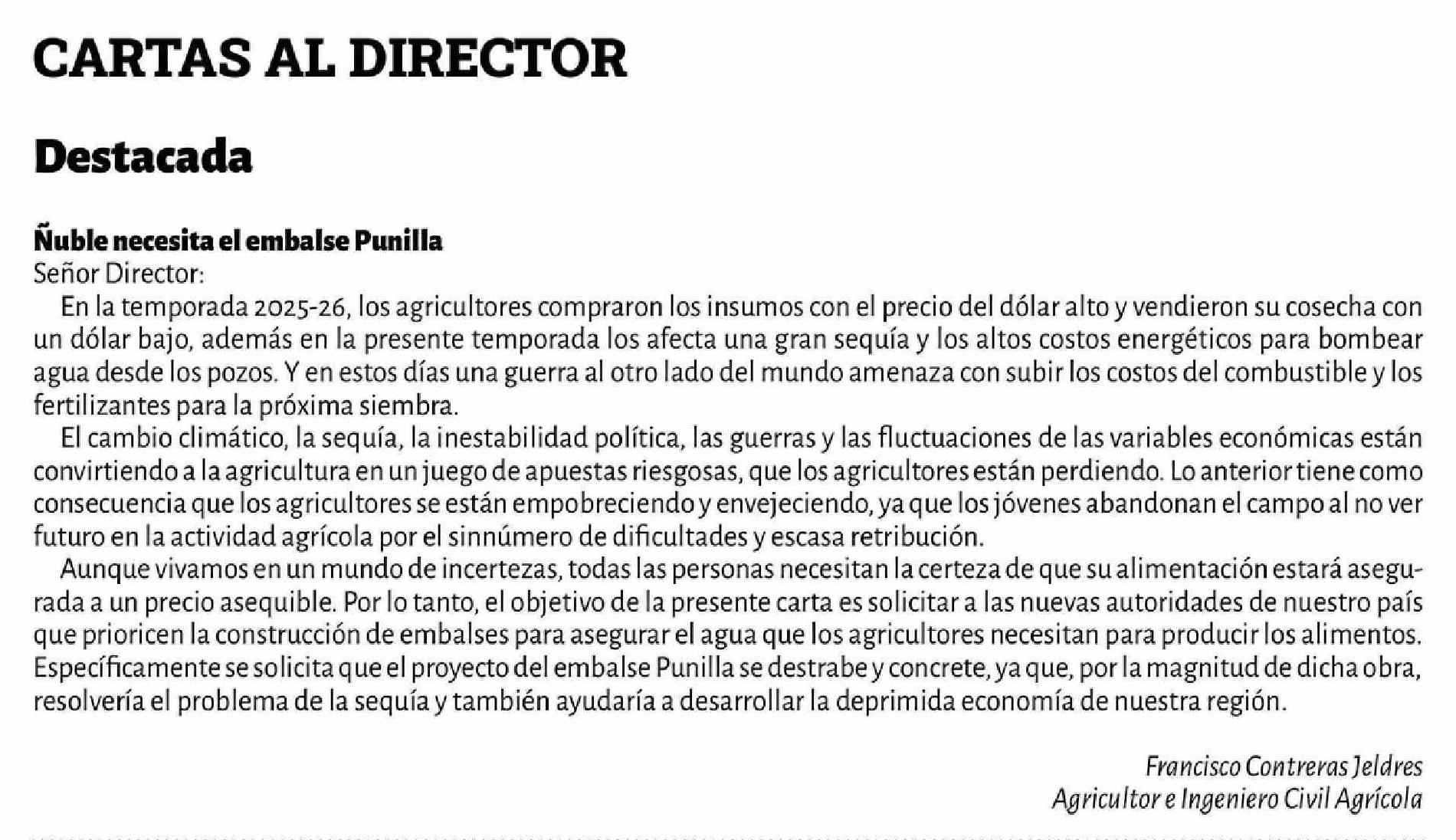 | Título: | Cartas: Ñuble necesita el embalse Punilla Señor Director: En la temporada 2025-26, los agricultores compraron los insumos con el precio del dólar alto y vendieron su cosecha con un dólar bajo, además en la presente temporada los afecta una gran sequía y los altos costos energéticos para bombear agua |