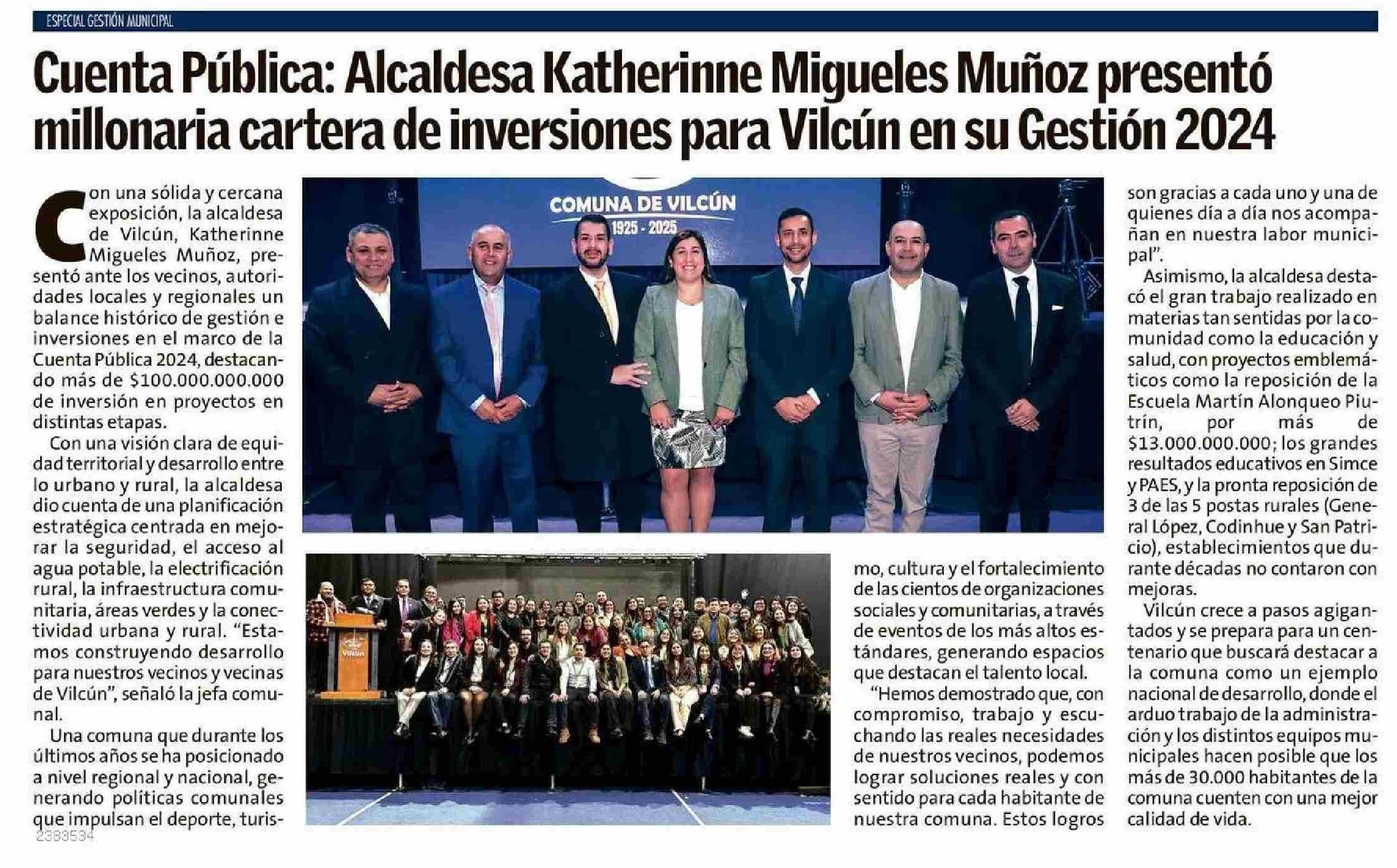 Cuenta Pública: Alcaldesa Katherinne Migueles Muñoz presentó millonaria cartera de inversiones para Vilcún en su Gestión 2024 11-06-2025 El Austral de la Araucanía |