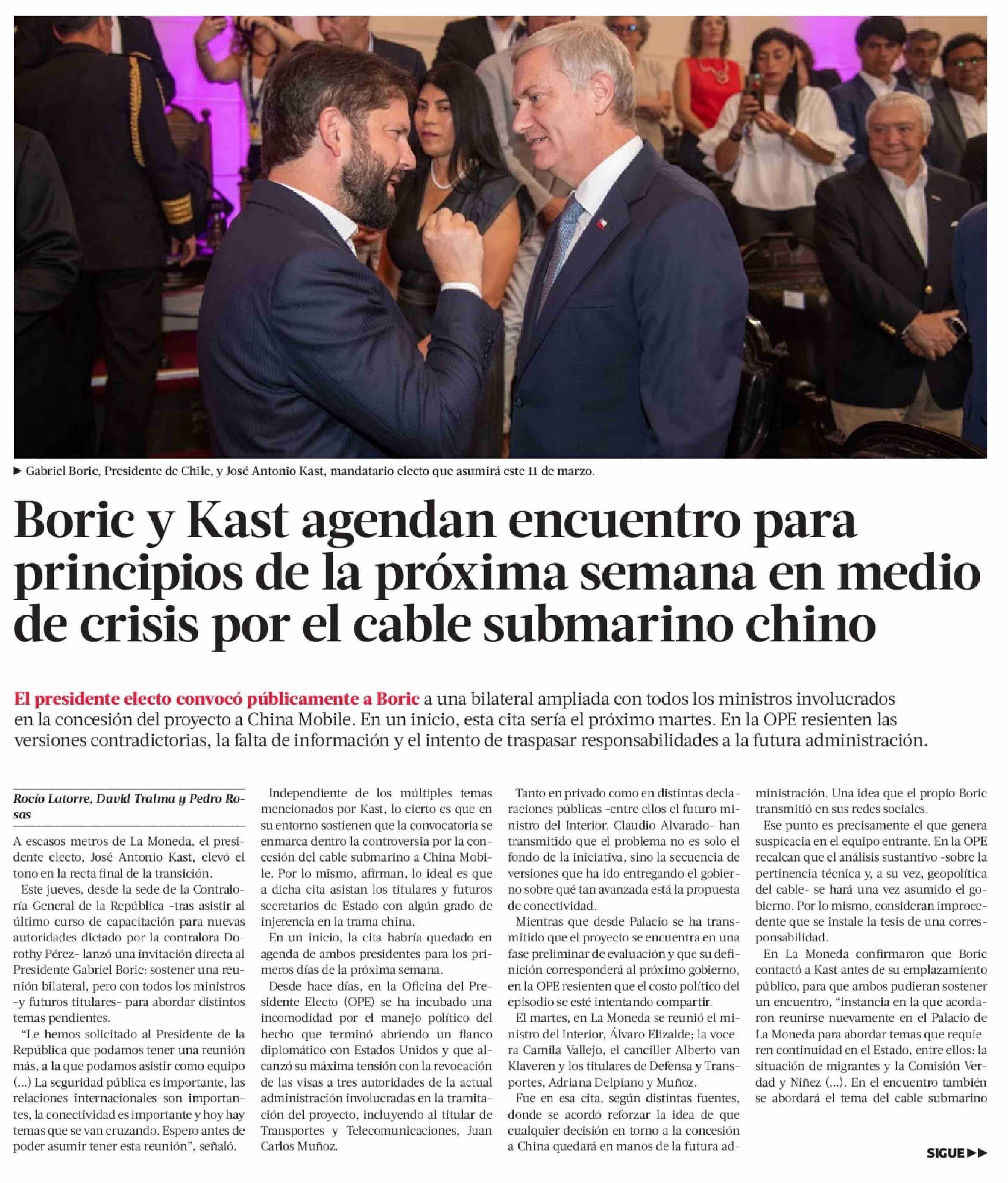 Título: Boric y Kast agendan encuentro para principios de la próxima semana en medio de crisis por el cable submarino chino