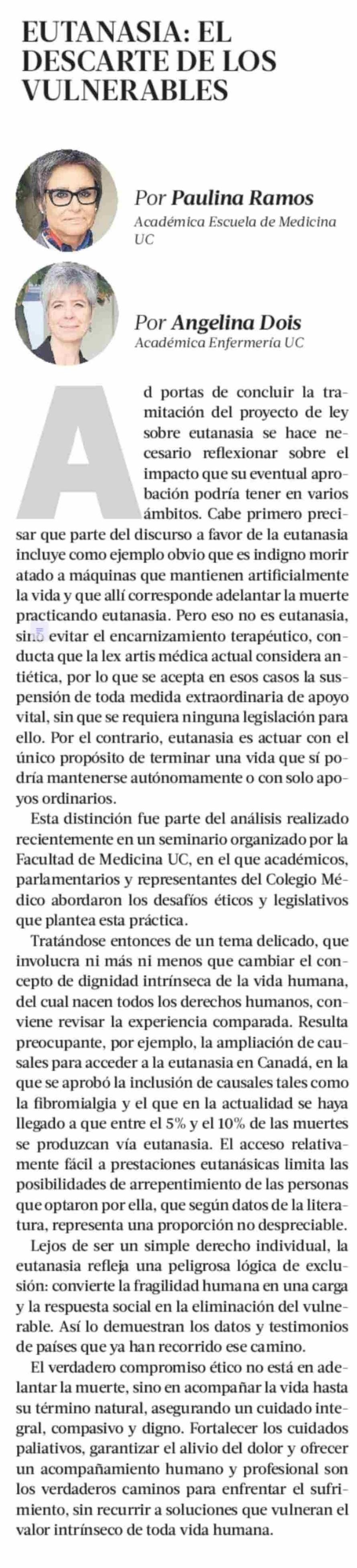 Columnas de Opinión: EUTANASIA: EL DESCARTE DE LOS VULNERABLES 03-05-2025 La Tercera |