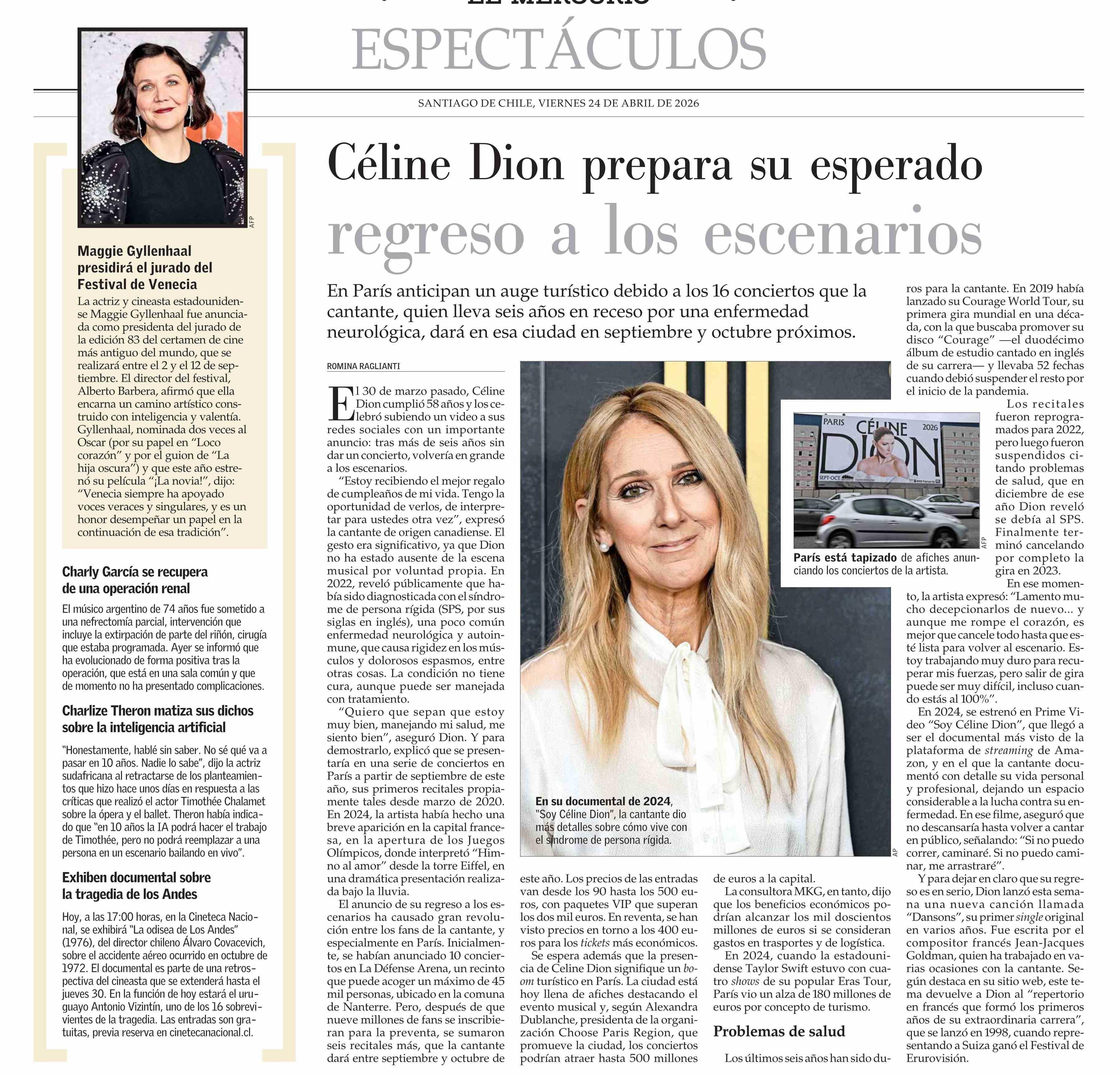 Céline Dion prepara su esperado reoreso a los escenarios 24-04-2026 El Mercurio |