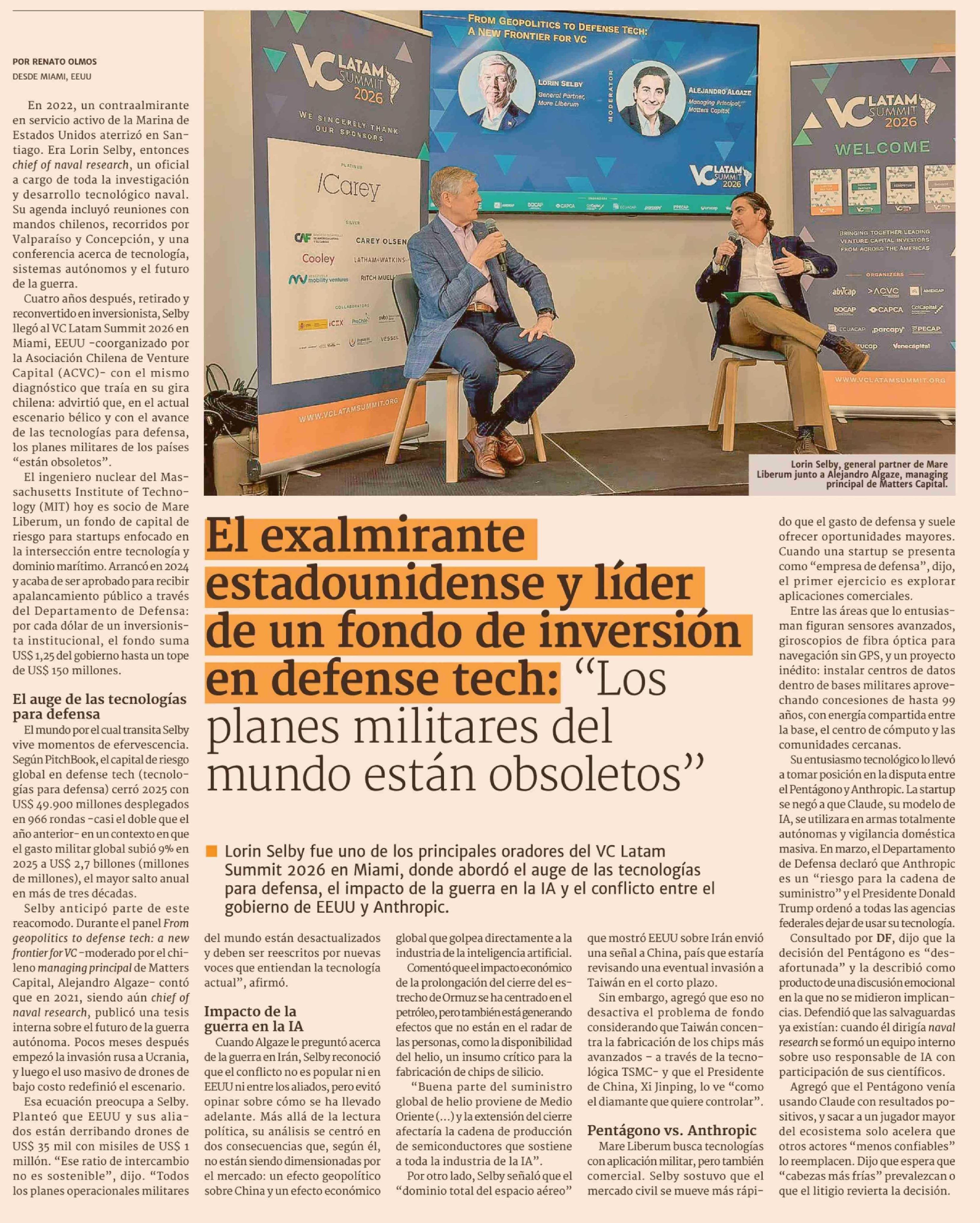 El exalmirante estadounidense y líder de un fondo de inversión en defense tech: "Los planes militares del mundo están obsoletos" 24-04-2026 Diario Financiero |
