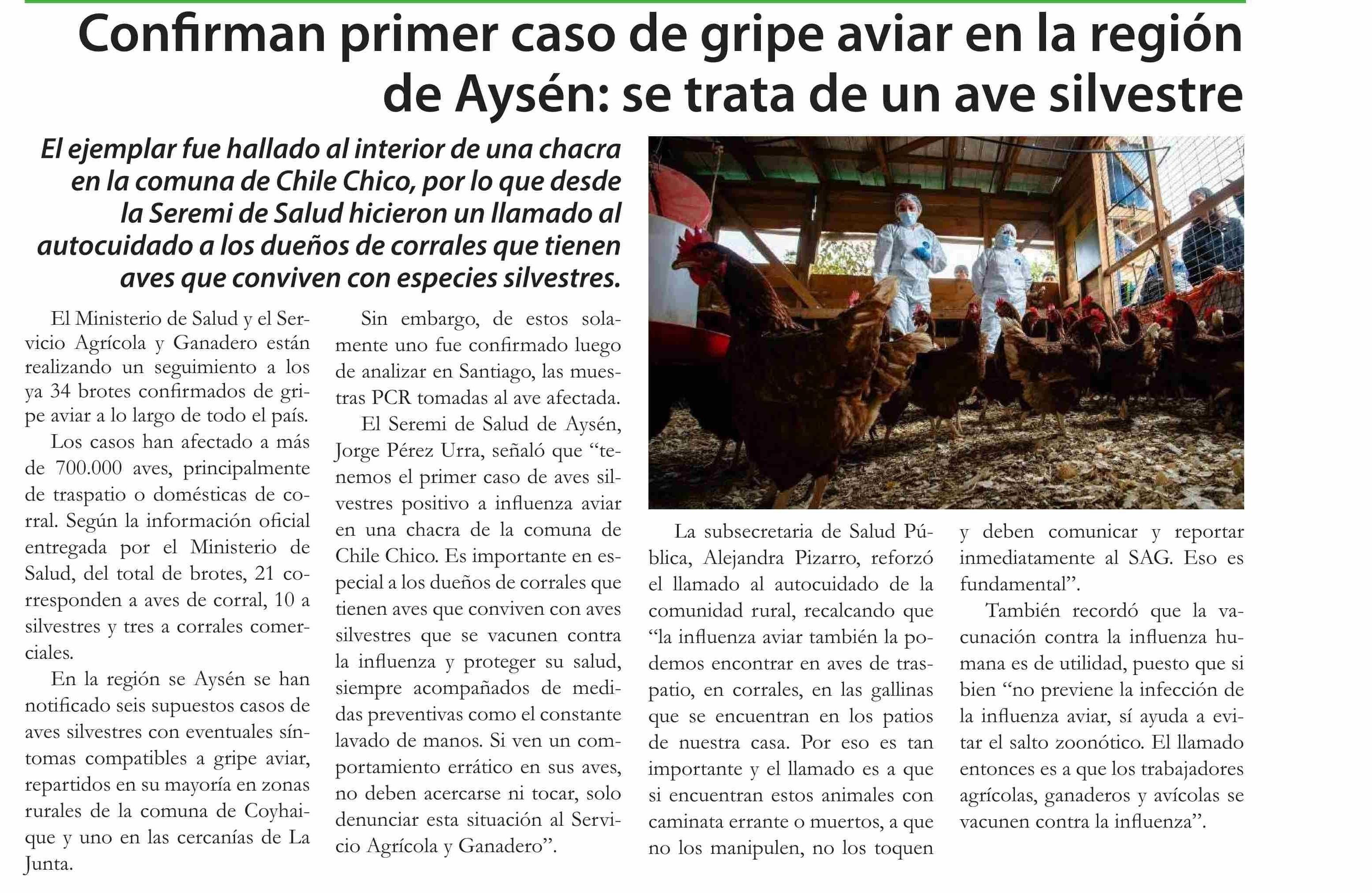 Título: Confirman primer caso de gripe aviar en la región de Aysén: se trata de un ave silvestre