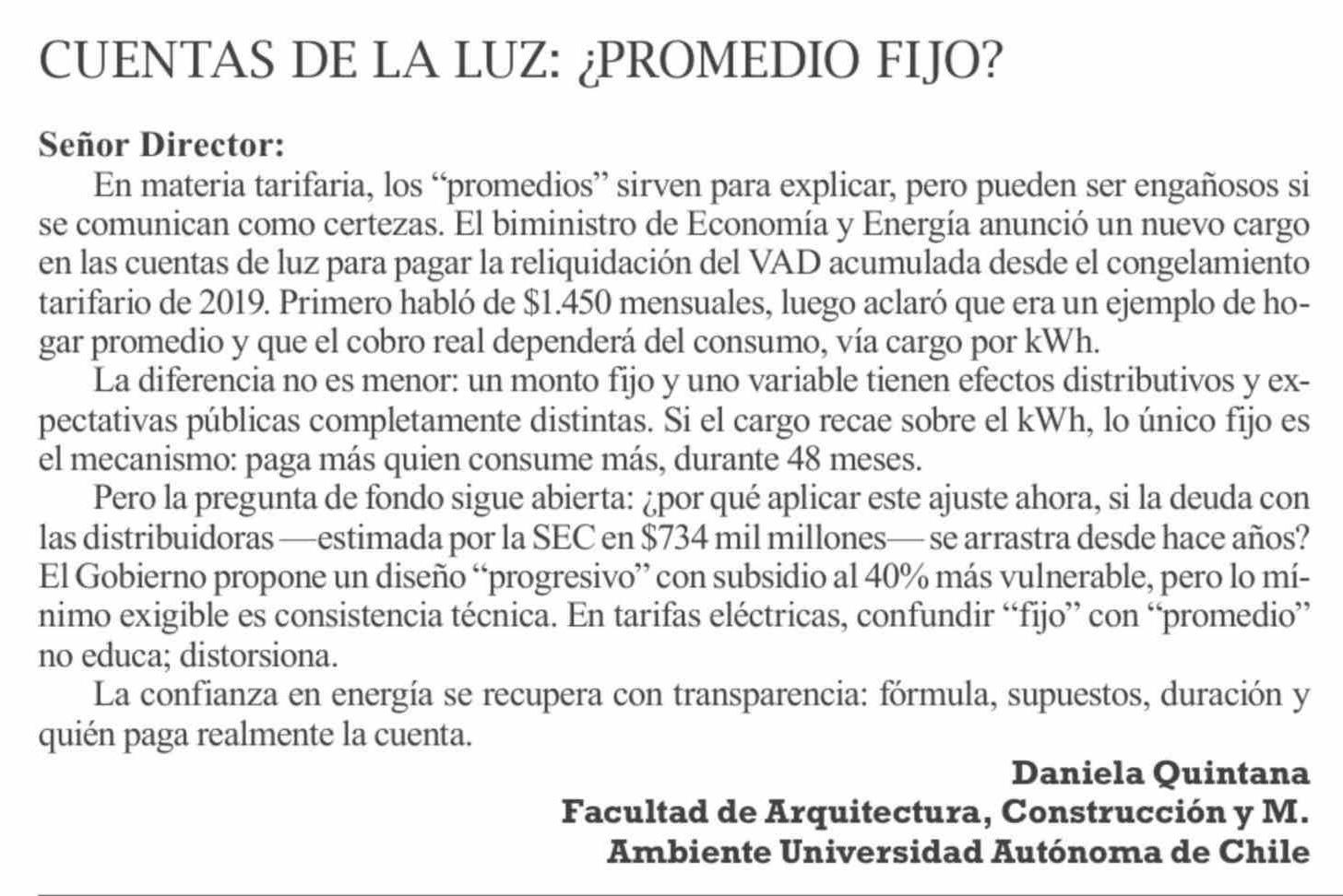 Cartas: CUENTAS DE LA LUZ: ¿ PROMEDIO FIJO?