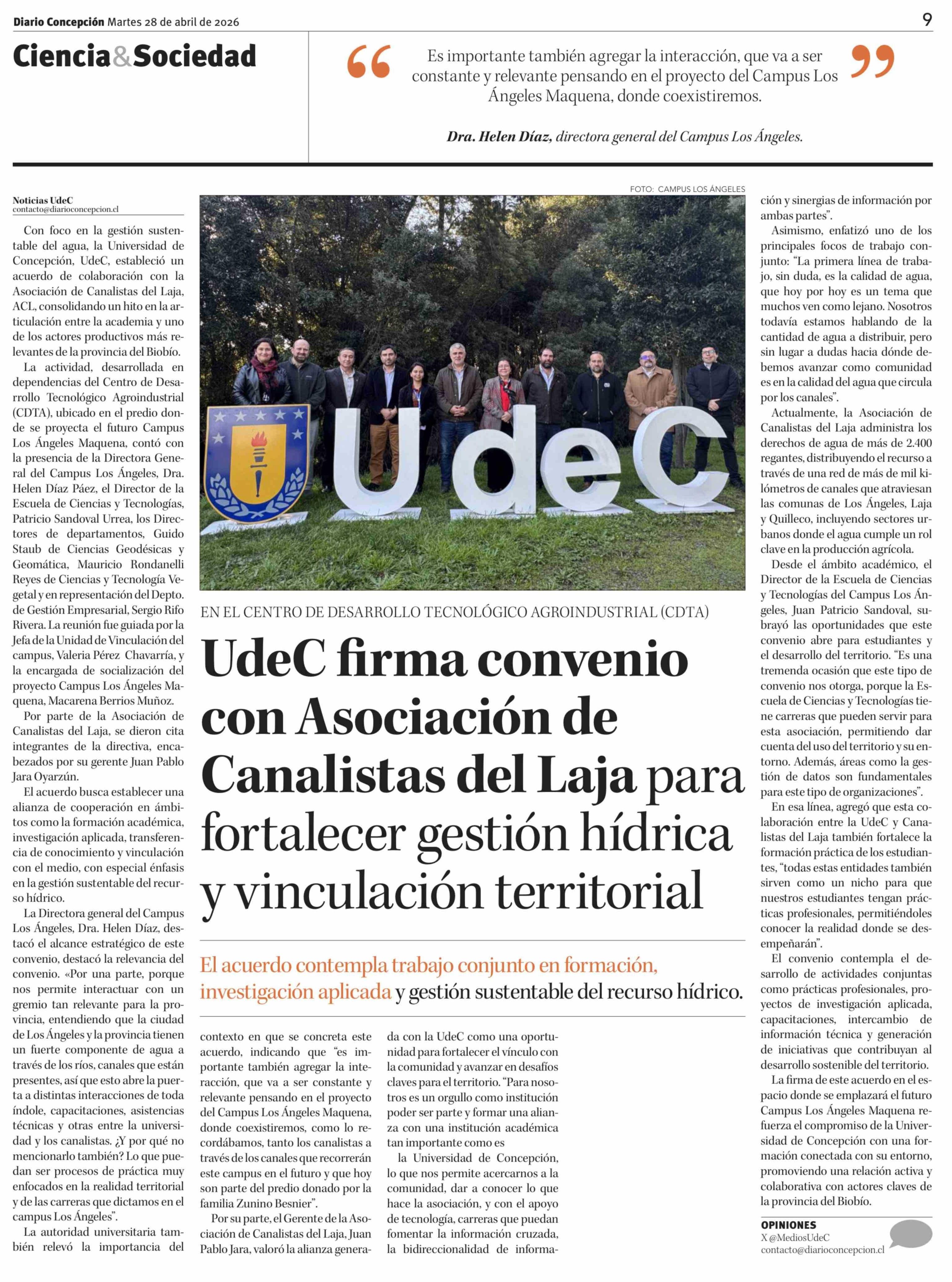 UdeC firma convenio con Asociación de Canalistas del Laja para fortalecer gestión hídrica y vinculación territorial 28-04-2026 Diario Concepción |