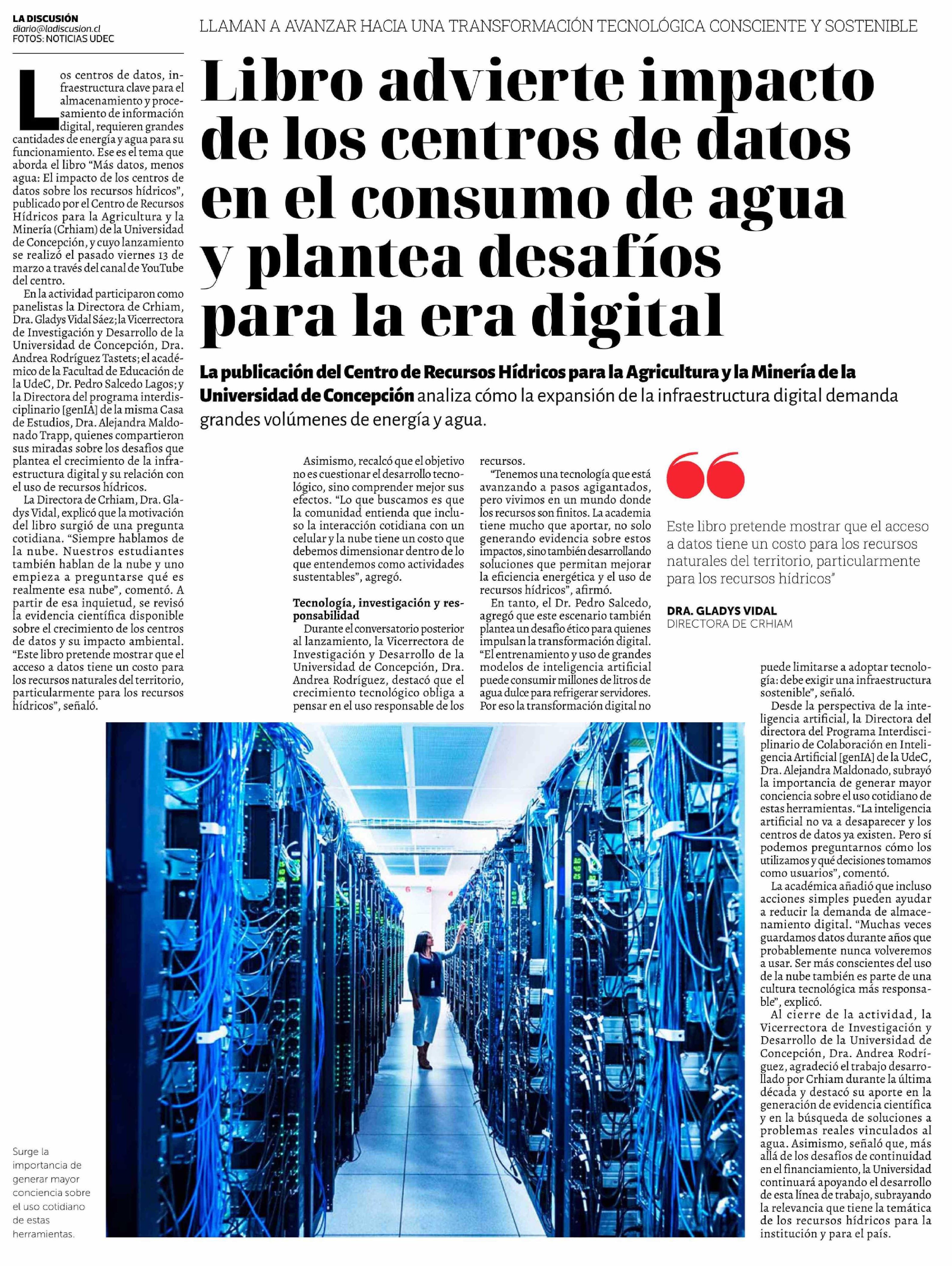 Libro advierte impacto de los centros de datos en el consumo de agua y plantea desafíos para la era digital 18-03-2026 La Discusión |