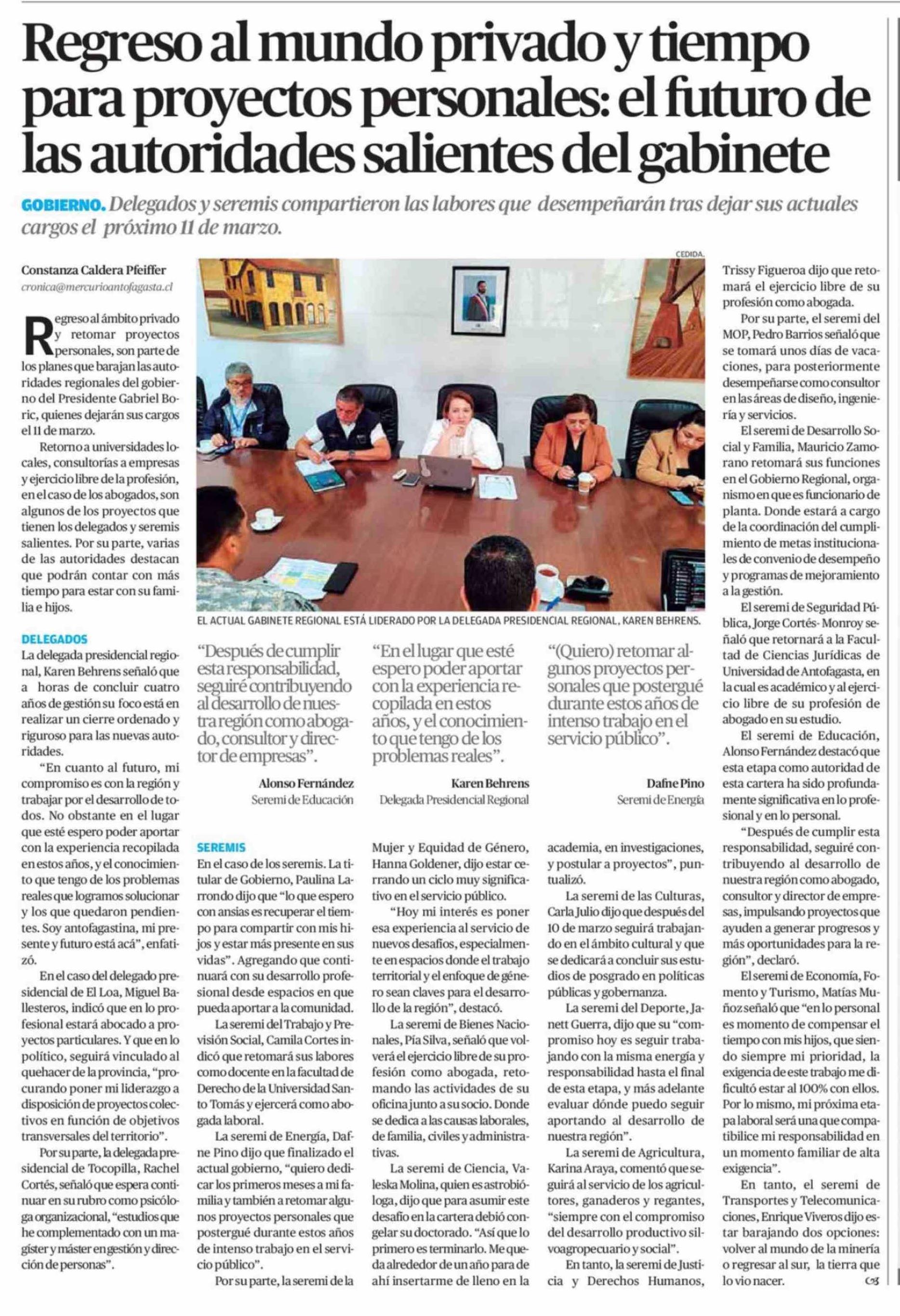 Regreso al mundo privado y tiempo para proyectos personales: el futuro de las autoridades salientes del gabinete 06-03-2026 El Mercurio de Calama |