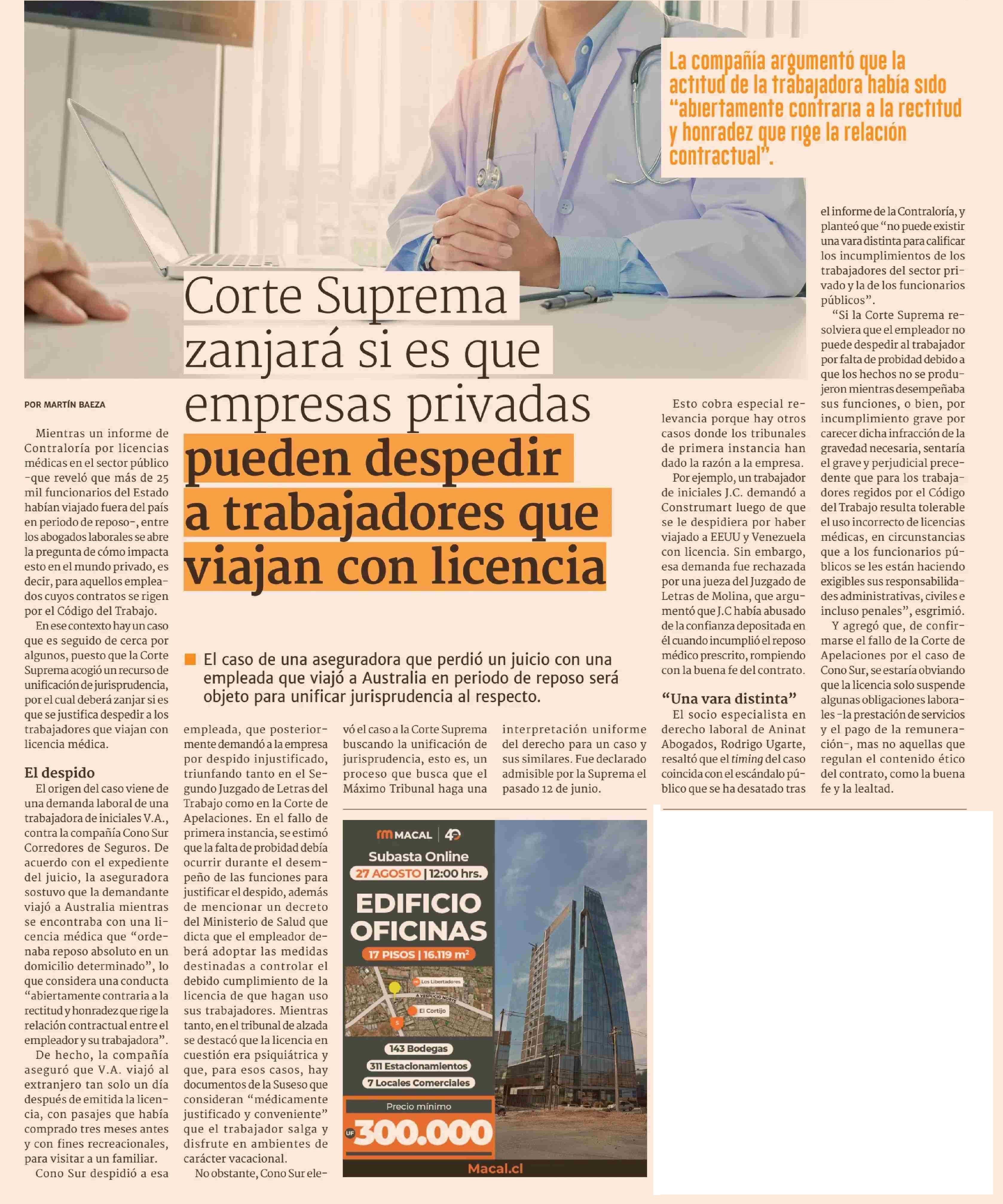 Corte Suprema zanjará si es que empresas privadas pueden despedir a trabajadores que viajan con licencia 18-06-2025 Diario Financiero |