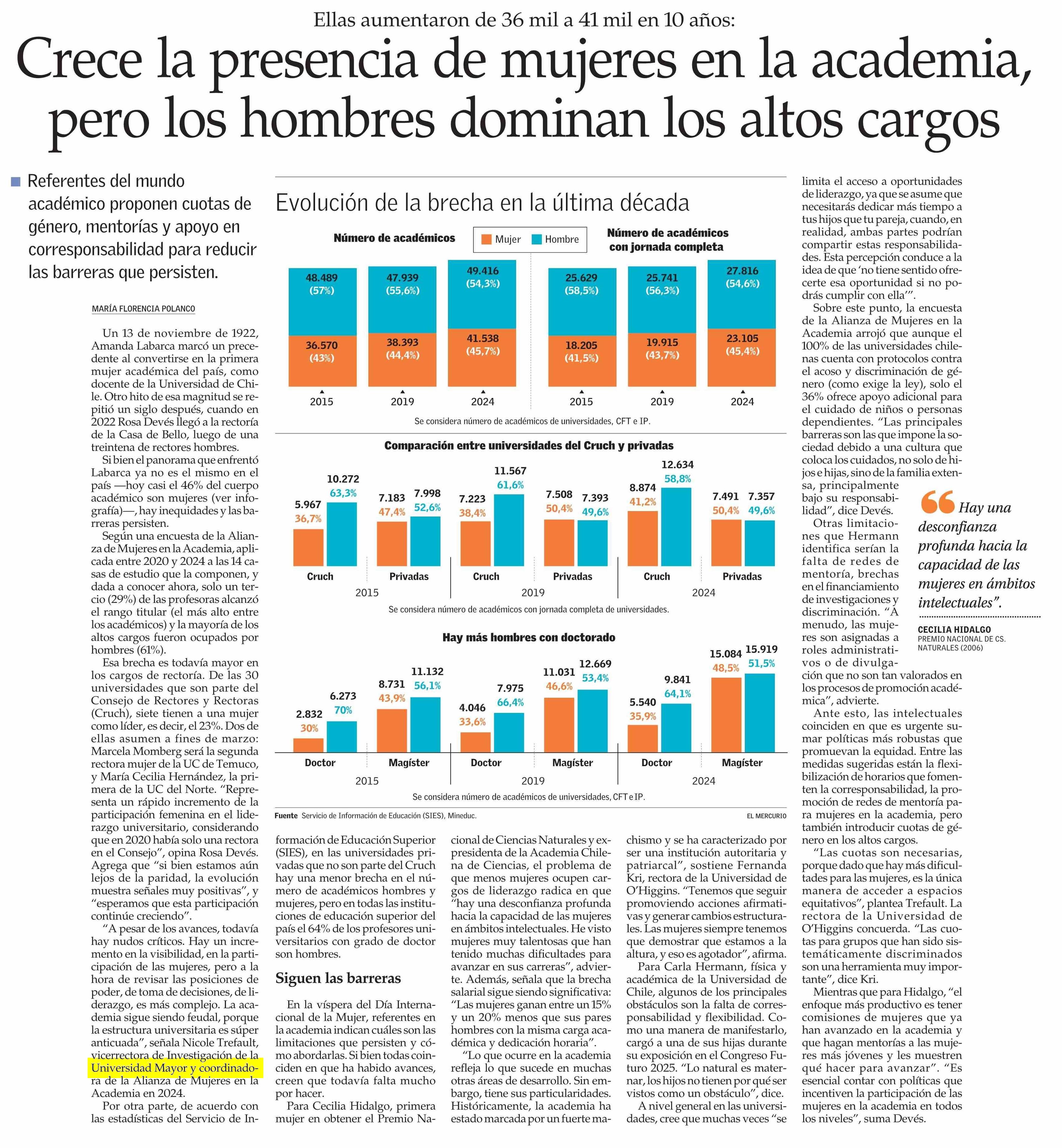 Crece la presencia de mujeres en la academia, pero los hombres dominan los altos cargos 02-03-2025 El Mercurio |