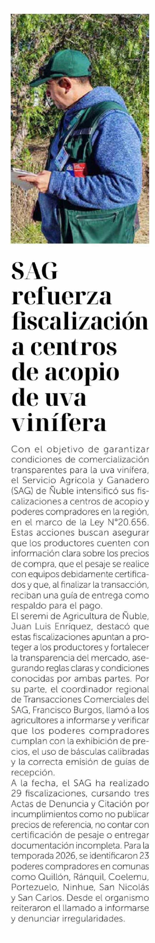 SAG refuerza fiscalización a centros de acopio de uva vinífera 20-04-2026 La Discusión |