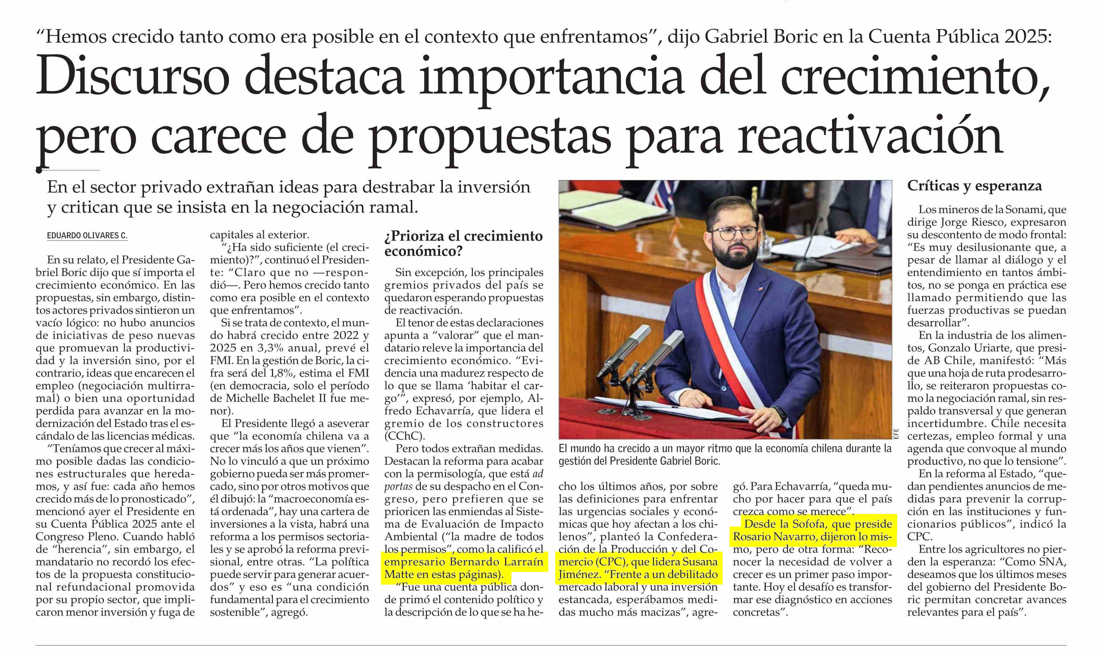Discurso destaca importancia del crecimiento, pero carece de propuestas para reactivación 02-06-2025 El Mercurio |