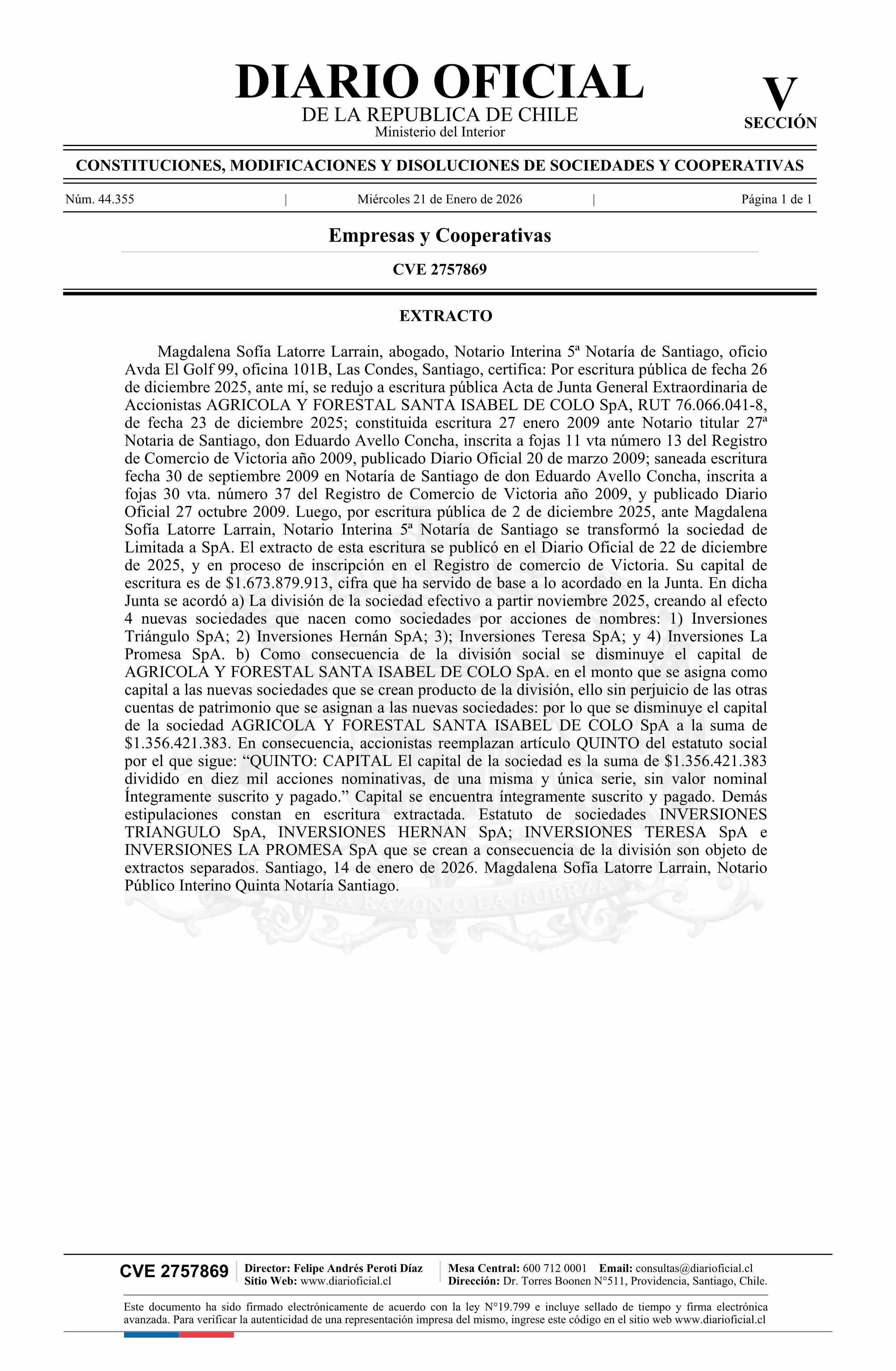 AGRICOLA Y FORESTAL SANTA ISABEL DE COLO SpA 76.066.041-8* 21-01-2026 Diario Oficial Edición Electrónica |
