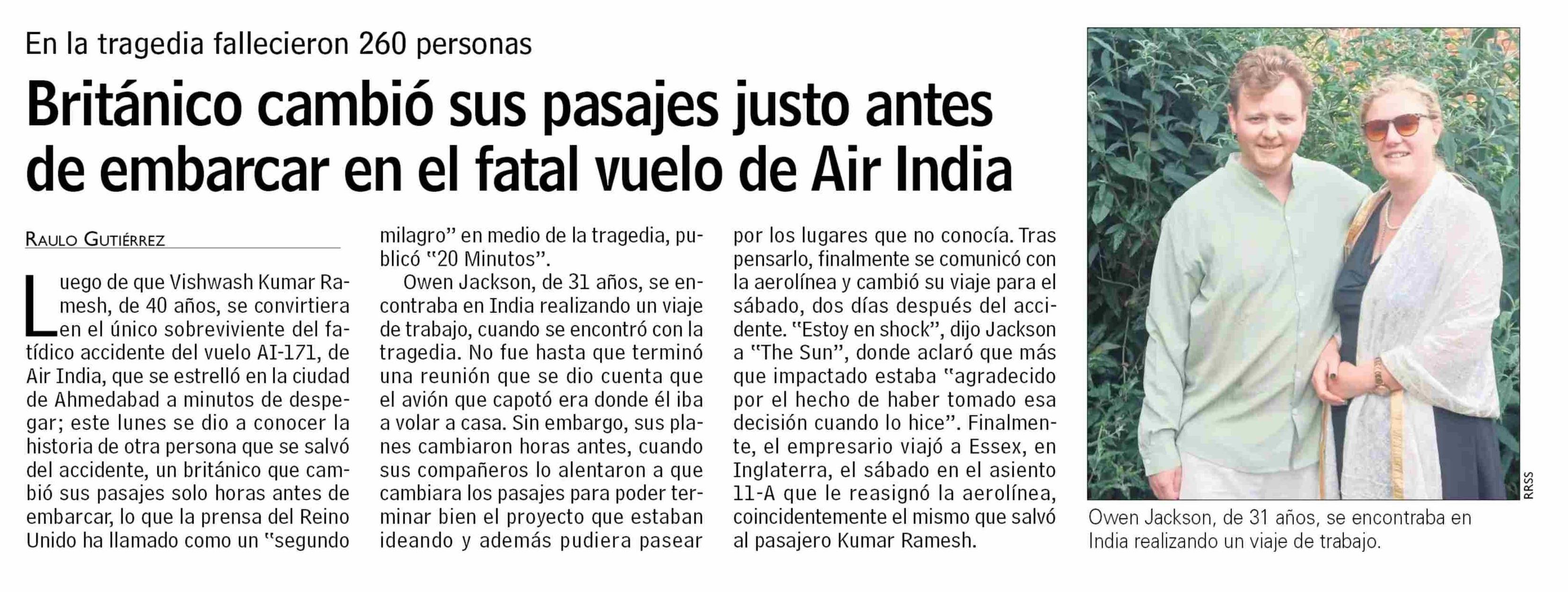 Británico cambió sus pasajes justo antes de embarcar en el fatal vuelo de Air India 17-06-2025 Las Últimas Noticias |