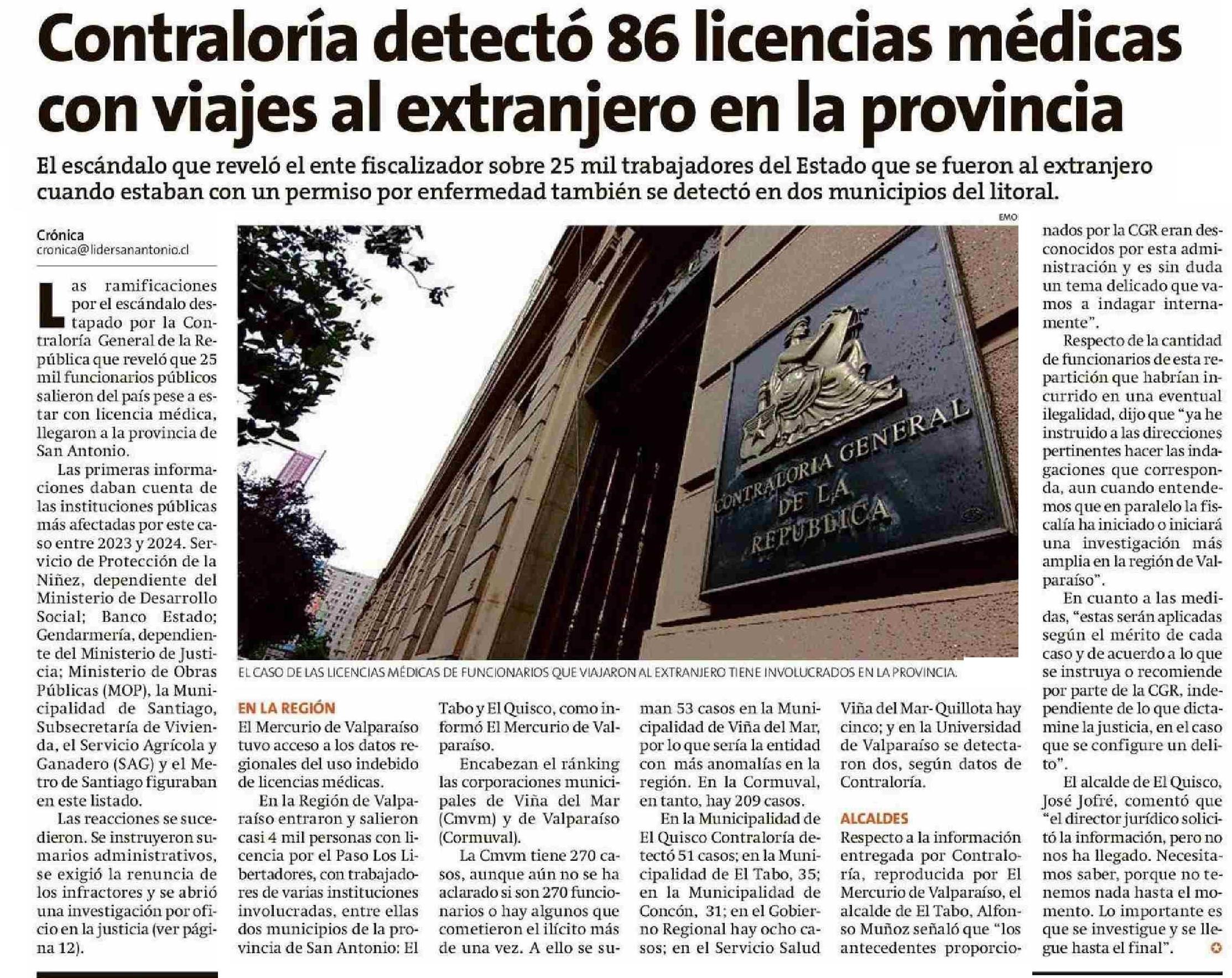 Contraloría detectó 86 licencias médicas con viajes al extranjero en la provincia 23-05-2025 El Líder |
