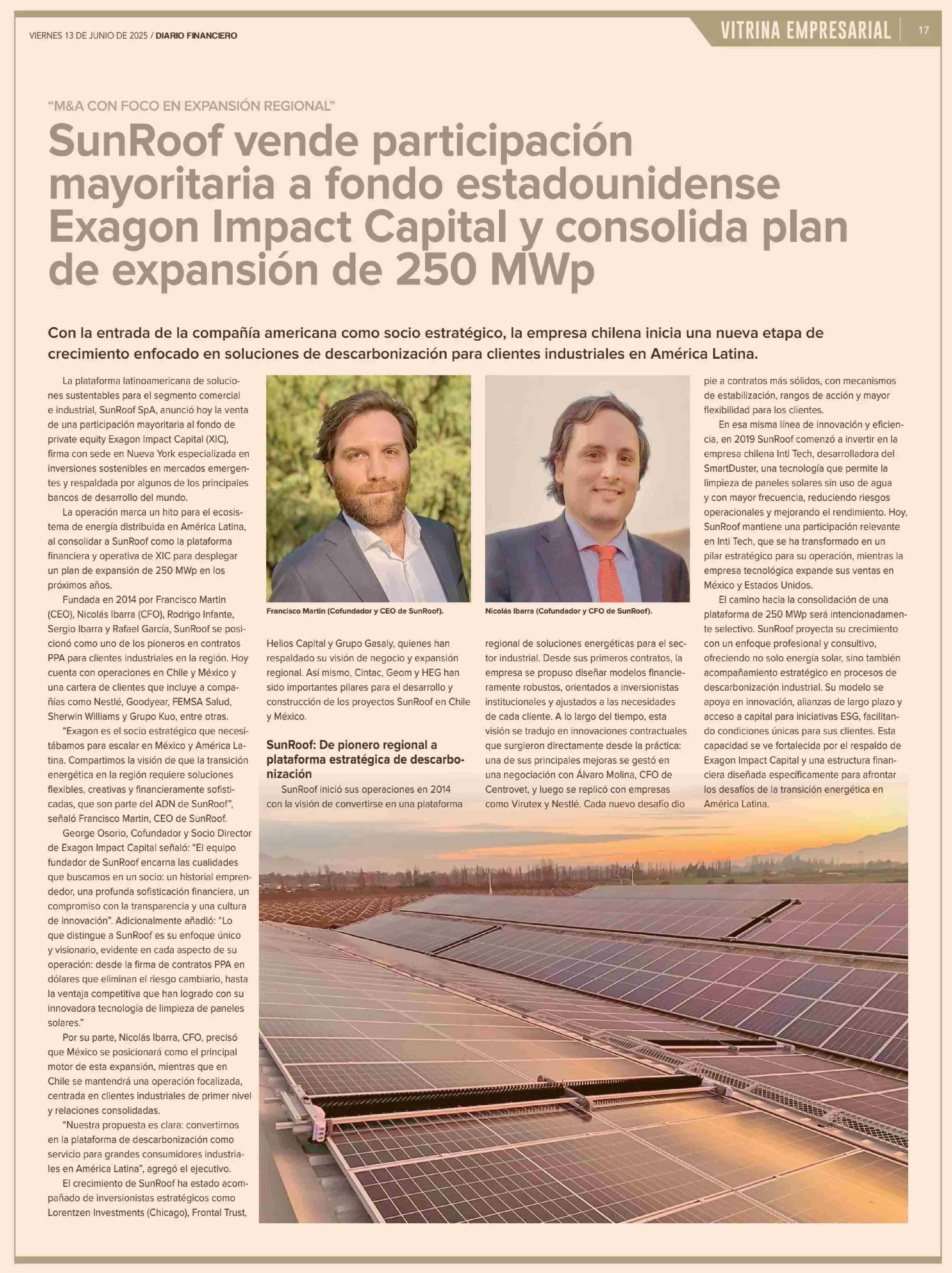 SunRoof vende participación mayoritaria a fondo estadounidense Exagon Impact Capital y consolida plan de expansión de 250 MWp 13-06-2025 Diario Financiero |
